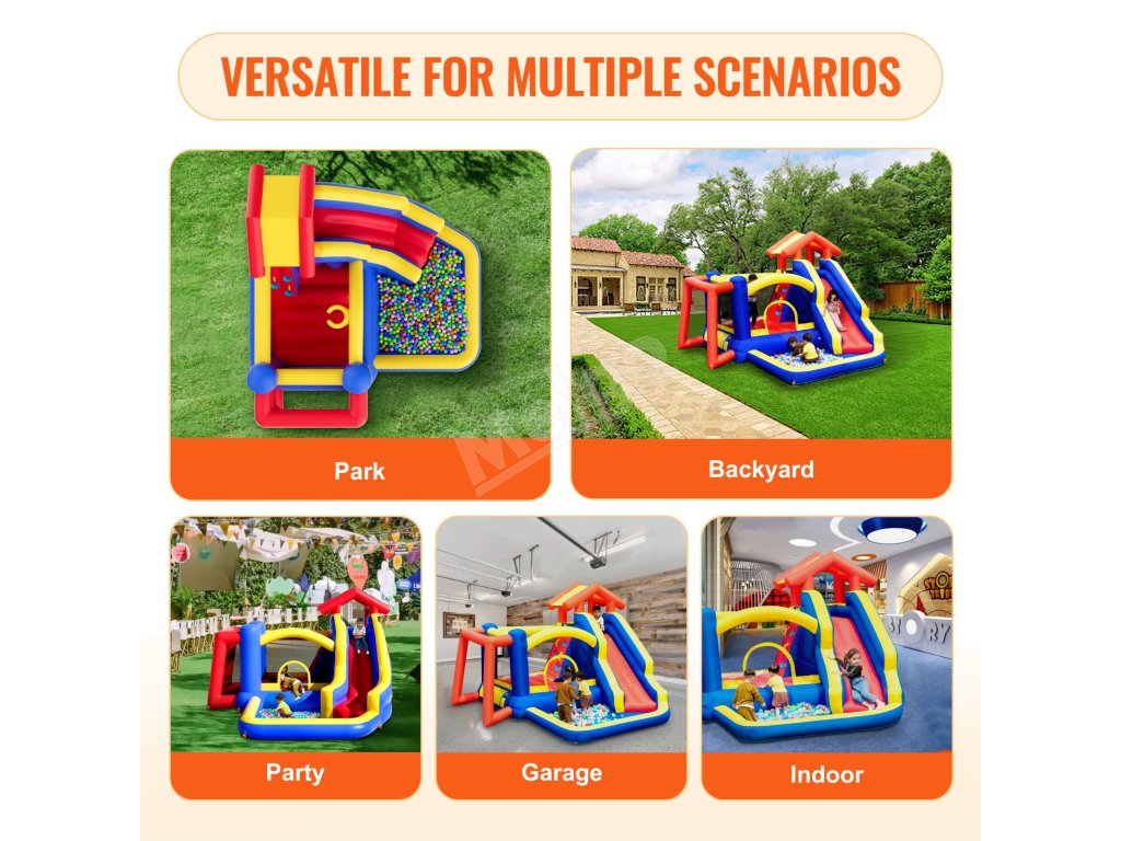 Skákací hrad je vybavený samolepiacimi opravnými záplatami na jednoduché opravovanie. Priehľadná farba neovplyvňuje jeho vzhľad, čím zabezpečuje jeho dlhú životnosť. Vhodné na narodeninové oslavy, rodinné stretnutia, festivalové oslavy a letné záhradné párty.