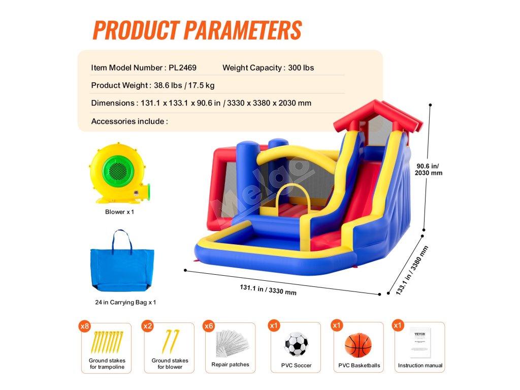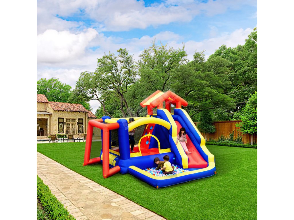 Detský hrad so šmýkačkou sa dodáva s taškou na prenášanie pre jednoduchú prepravu. Montáž a demontáž sú jednoduché, pričom nafúknutie trvá menej ako 3 minúty. Pred rozložením na nafúknutie nezabudnite skontrolovať, či sa na zemi nenachádzajú ostré predmety.