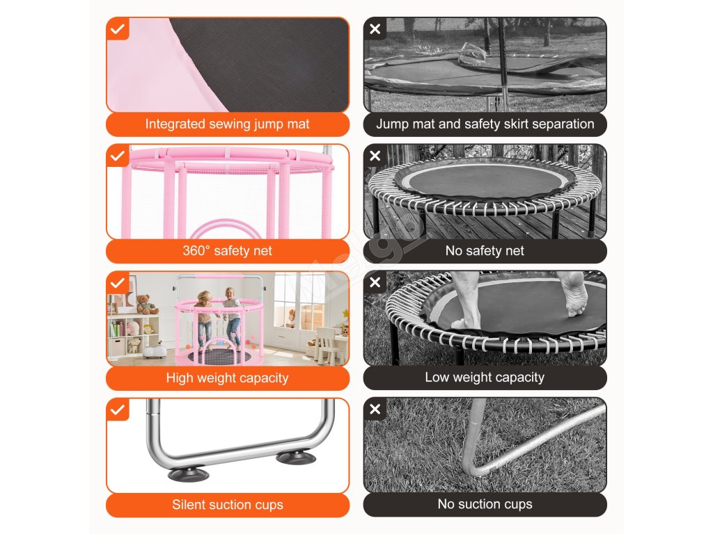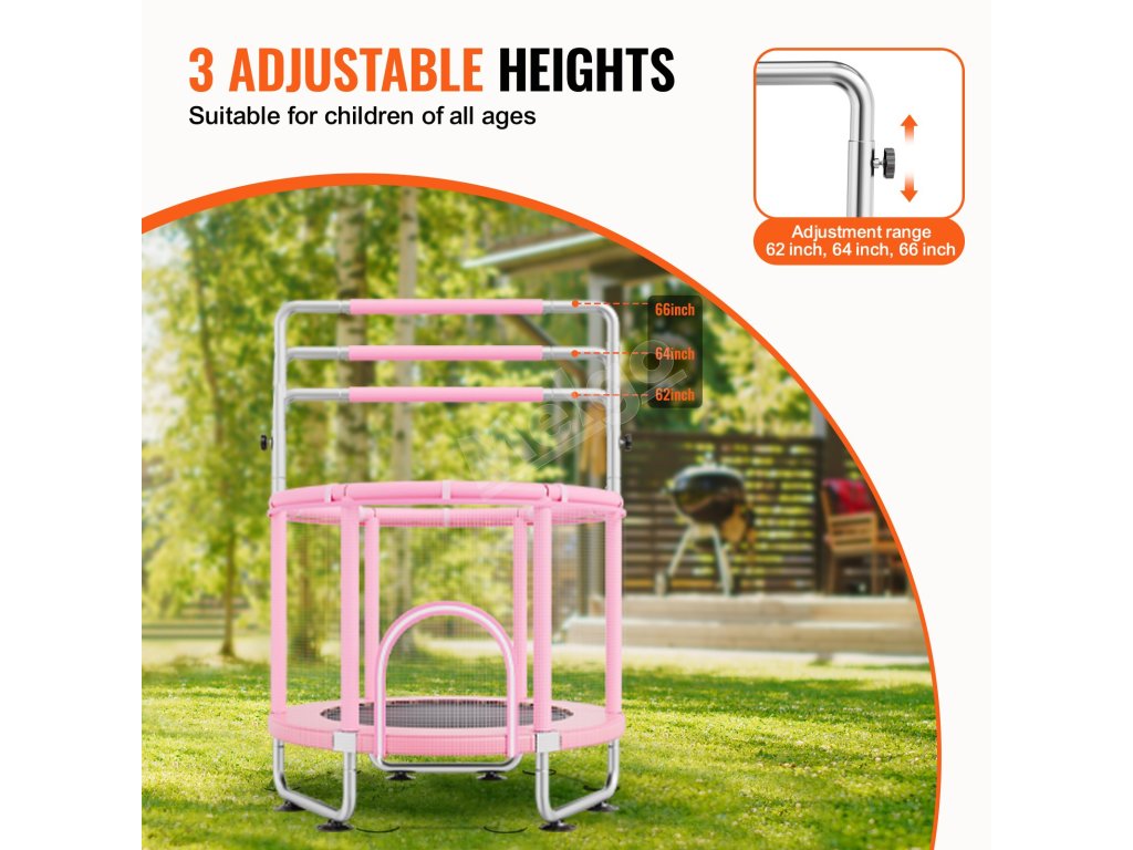 K dispozícii sú tri možnosti výšky, nastaviteľné od 59 palcov, 60 palcov alebo 62 palcov, naša mini detská trampolína pre batoľatá je vhodná pre všetky vekové kategórie, účinne uvoľňuje prirodzenú energiu detí pre najlepšiu rodinnú aktivitu.