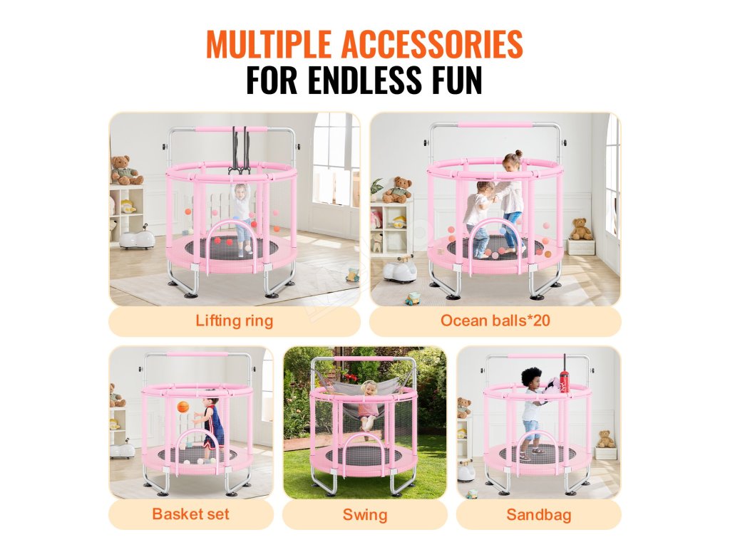 Trampolína pre batoľatá sa dodáva s príslušenstvom, ako sú krúžky, hojdačky, vrecia s pieskom, oceánske lopty a basketbalový set. Možno ju nainštalovať v interiéri, exteriéri, na záhrade alebo na dvore, čím sa batoľatá udržia ďaleko od elektroniky a podporí sa ich fyzický rast. Je to najlepšia voľba na darčeky na dovolenku.
