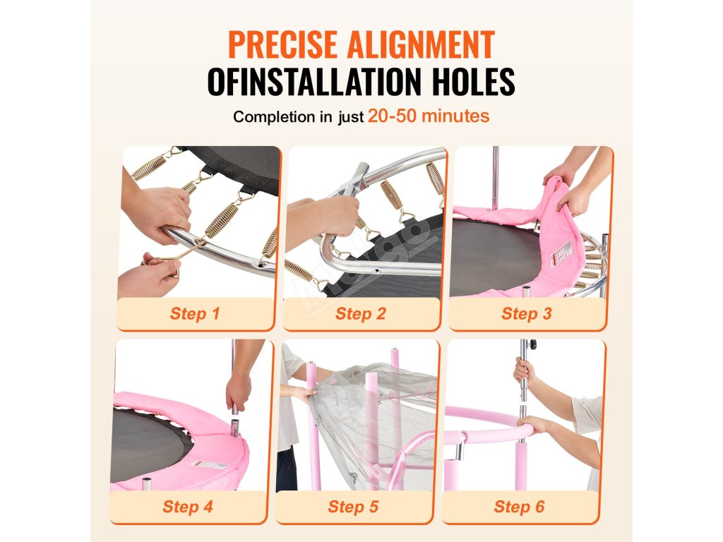 Na zostavenie trampolíny pre batoľatá je potrebná len jedna dospelá osoba. Podľa pokynov zostavte rám, utiahnite nohy a pripevnite podložku k rámu na skákanie. Montážne otvory a závity sú presne prispôsobené na inštaláciu v jednom kroku.