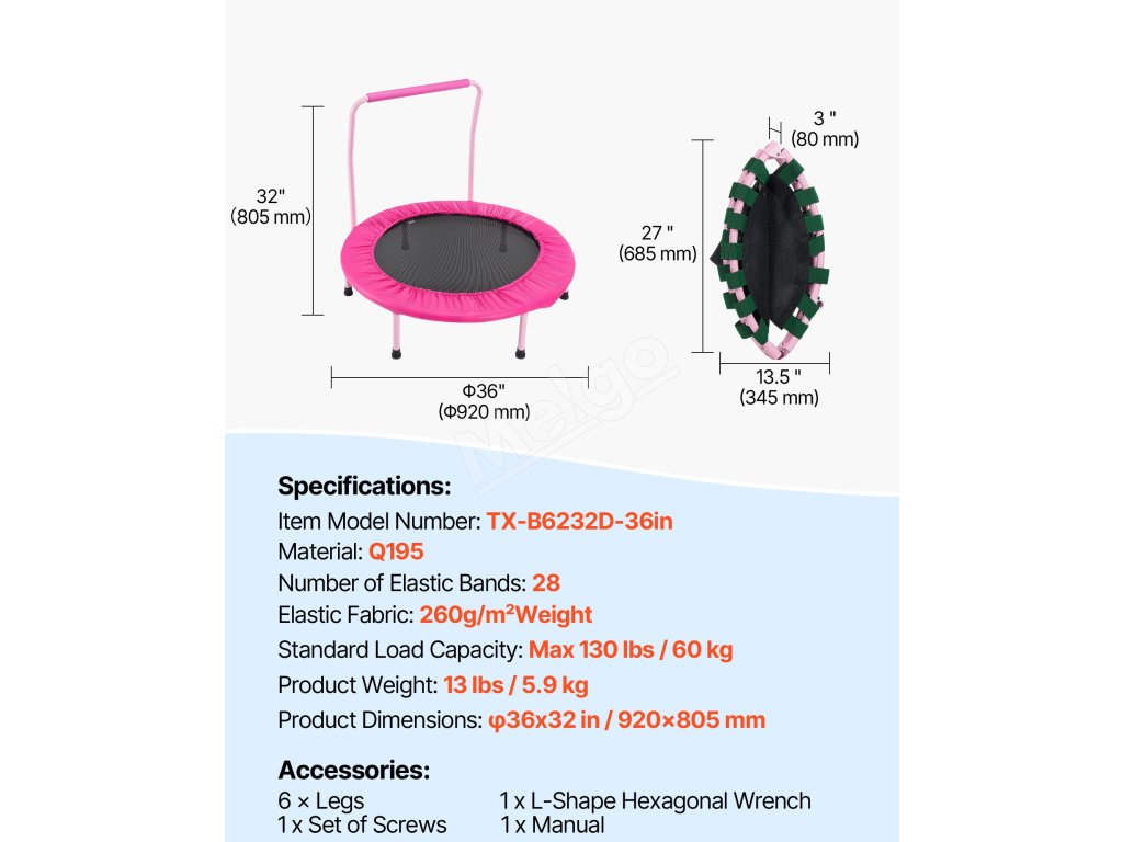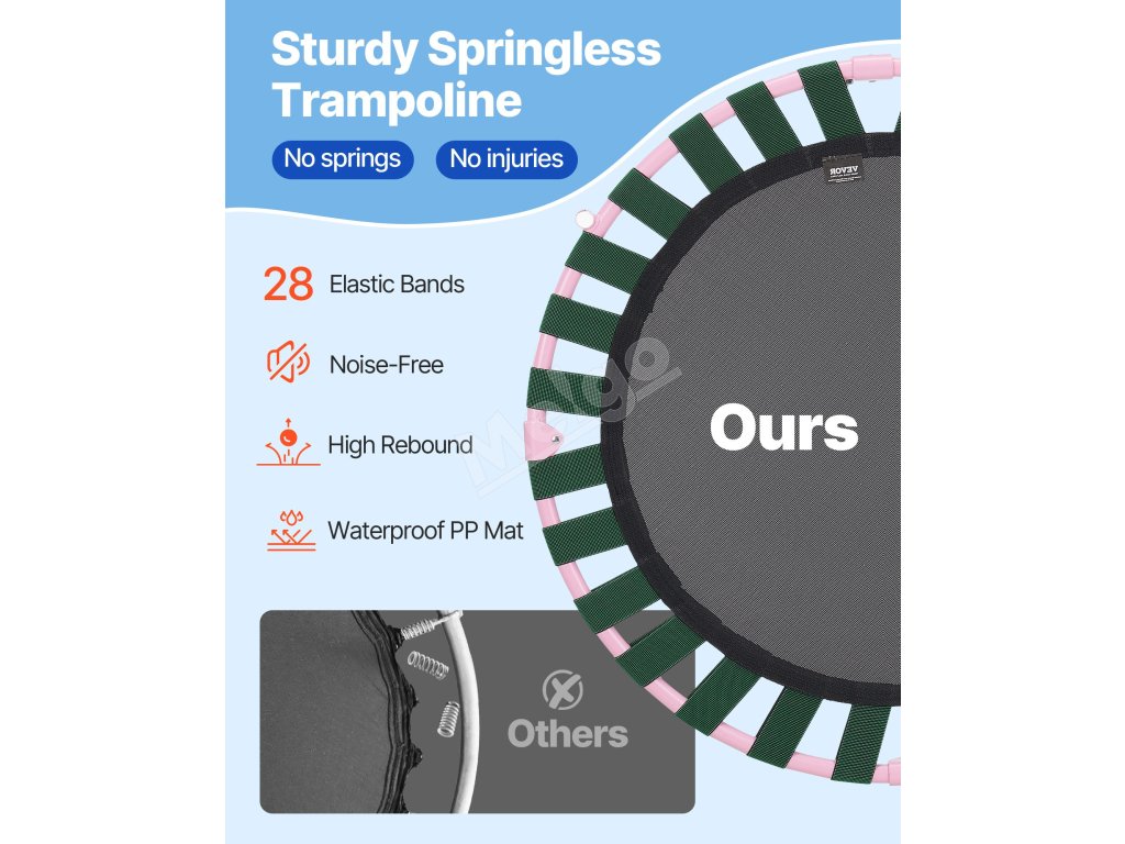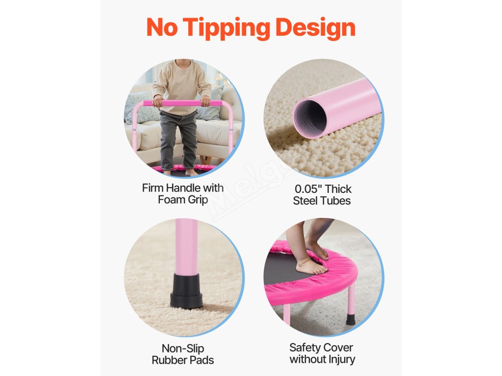 Trampolína pre batoľatá je vyrobená s odolným rámom, PP podložkou na skákanie a bezpečnostnou podložkou, plochými elastickými pásmi, rúrkami na nohy s gumovou hlavou a rukoväťami potiahnutými penou, čo zaručuje robustnosť a odolnosť a zároveň sa ľahko čistí a udržiava. Gumené podložky pod nohy poskytujú tlmenie pre tichú prevádzku.
