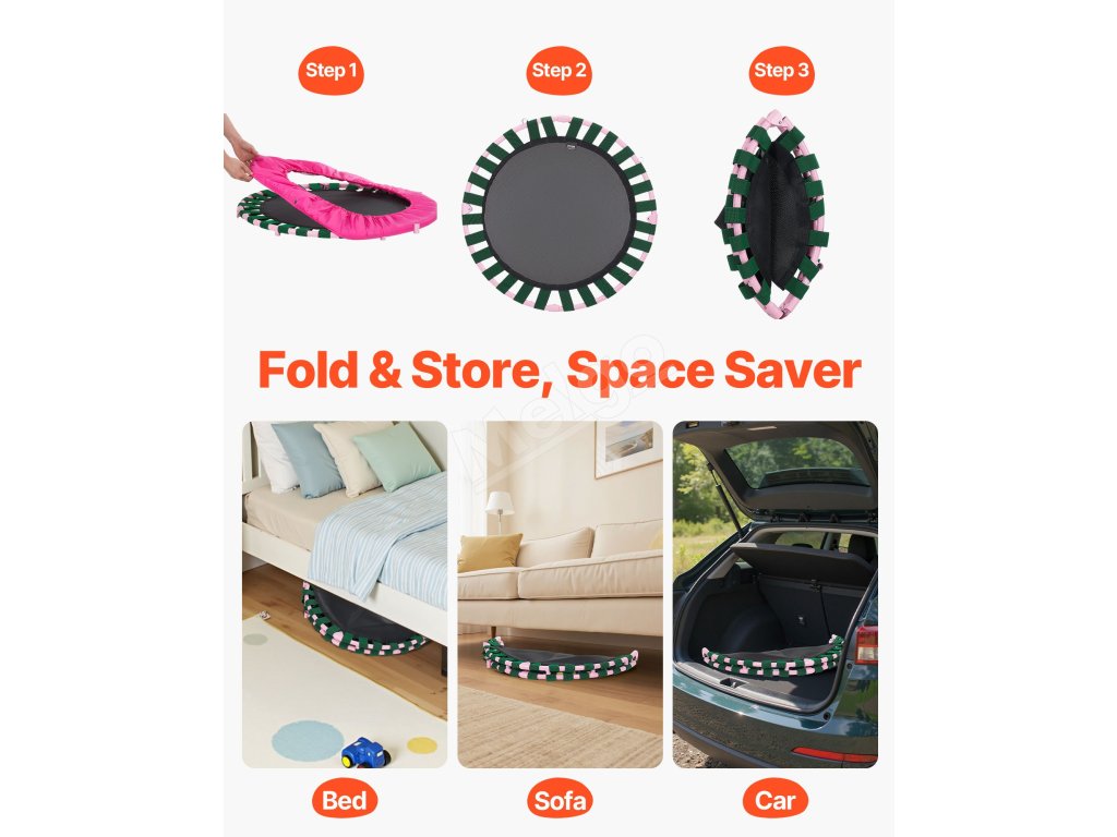 Vďaka skladaciemu dizajnu sa naša mini detská trampolína pre batoľatá ľahko prenáša, takže deti môžu skákať, kdekoľvek sa im zapáči. Možno ju uložiť pod pohovku alebo do kufra auta, čím sa šetrí miesto.