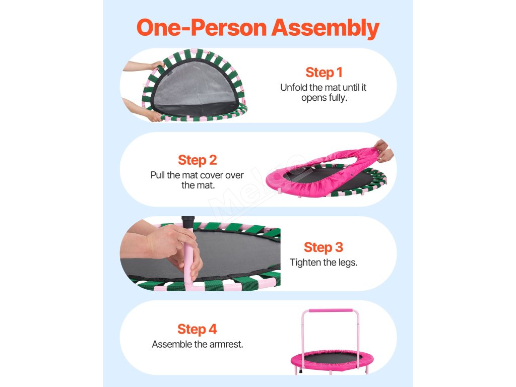 Na zostavenie trampolíny pre batoľatá je potrebná len jedna dospelá osoba. Podľa návodu zostavte rám, utiahnite nohy a pripevnite podložku k rámu na skákanie. Montážne otvory a závity sú presne prispôsobené na inštaláciu v jednom kroku.