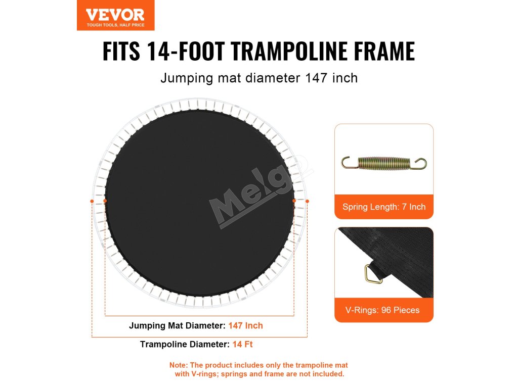 Vhodná pre 14-metrové okrúhle trampolíny s 96 V-krúžkami, s použitím 7-palcových pružín a priemerom rohože 147 palcov. Poznámka: Rám a pružiny nie sú súčasťou balenia.