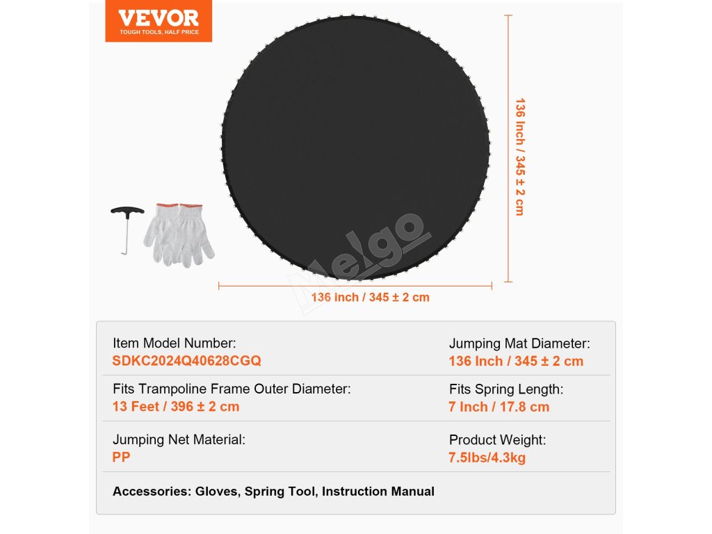 Vhodná pre okrúhle trampolíny s dĺžkou 13 stôp, s 80 V-krúžkami, s použitím 7-palcových pružín a priemerom rohože 136 palcov. Poznámka: Rám a pružiny nie sú súčasťou balenia.