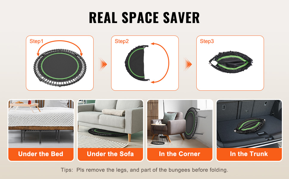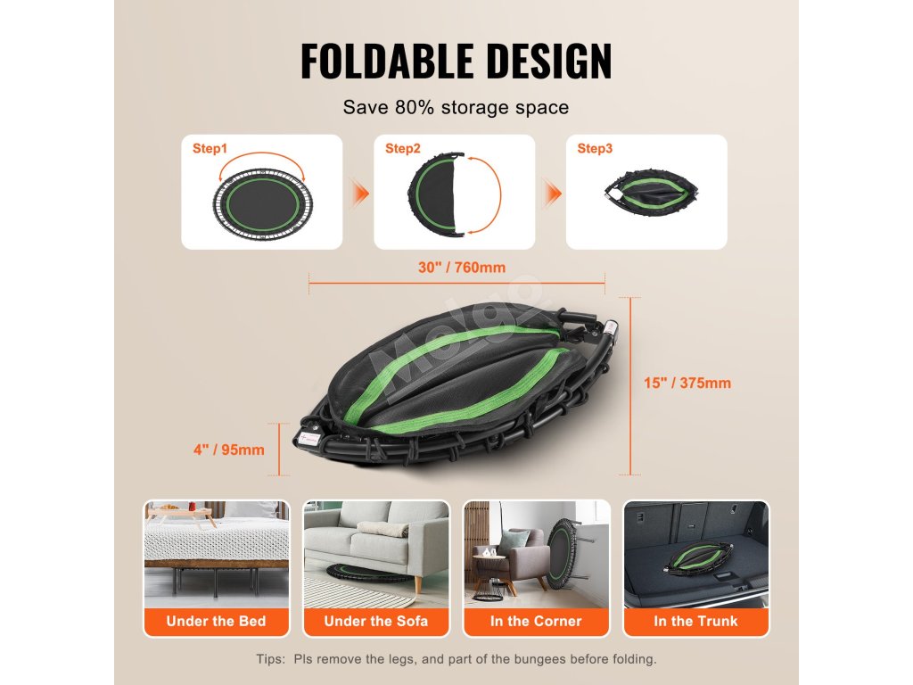 Optimalizujte si úložný priestor vďaka fitness odrážadlu, ktoré sa zloží na 80 % svojej pôvodnej veľkosti. Ľahko ho uložíte pod posteľ, pohovku, do rohov alebo dokonca do kufra auta.