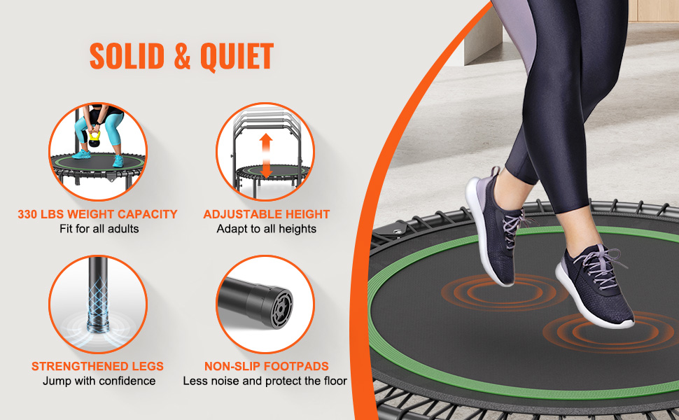 Cvičte v pokoji s fitness trampolínou, ktorá je navrhnutá na tichú prevádzku. Protišmykové podložky pod nohy znižujú hluk a chránia vaše podlahy.