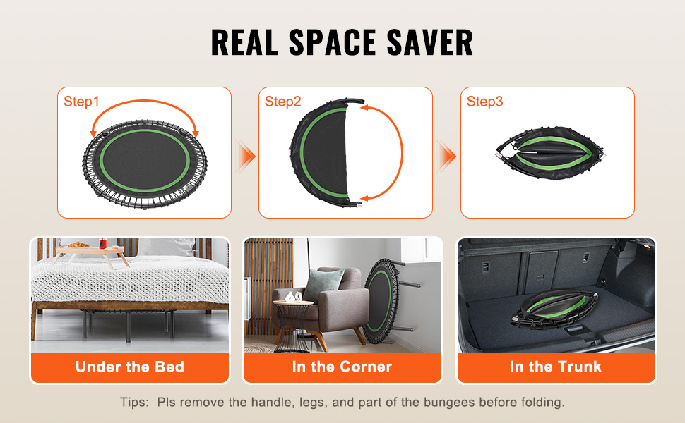 Optimalizujte si úložný priestor vďaka trampolíne na cvičenie, ktorá sa zloží na 80 % svojej pôvodnej veľkosti. Ľahko ju uložíte pod postele, pohovky, do rohov alebo dokonca do kufra auta.