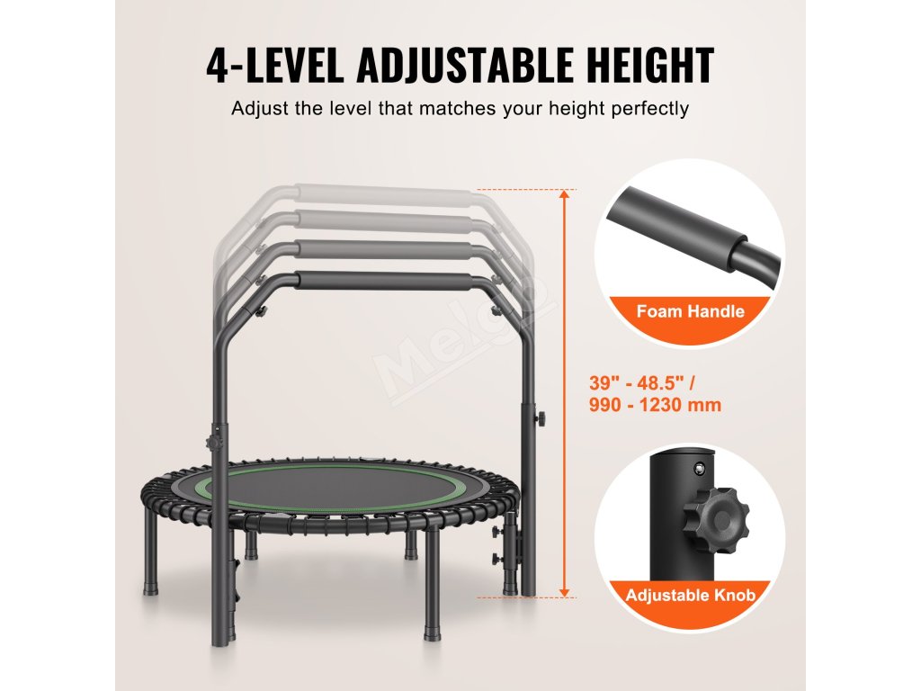 Nájdite si ideálnu výšku odrazu pomocou rukoväte interiérovej trampolíny, ktorá sa nastavuje do 4 rôznych úrovní od 39 do 48,5 palca. Prispôsobte si výšku svojmu pohodliu a optimalizujte svoj tréningový výkon.