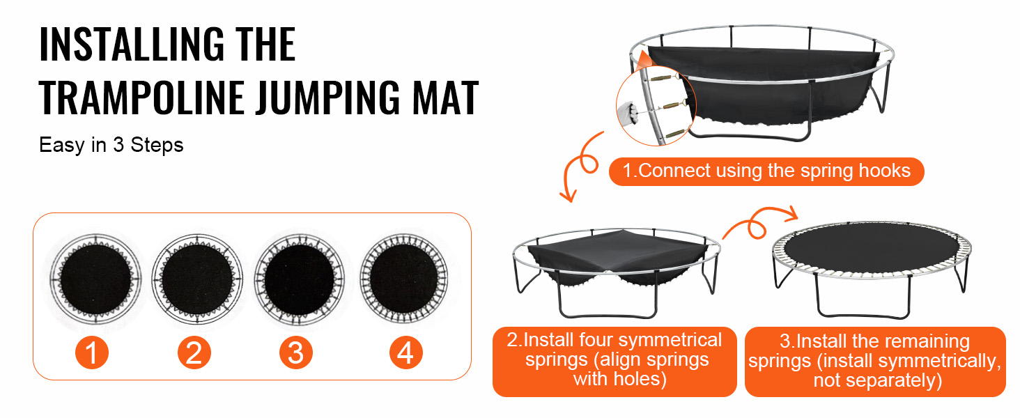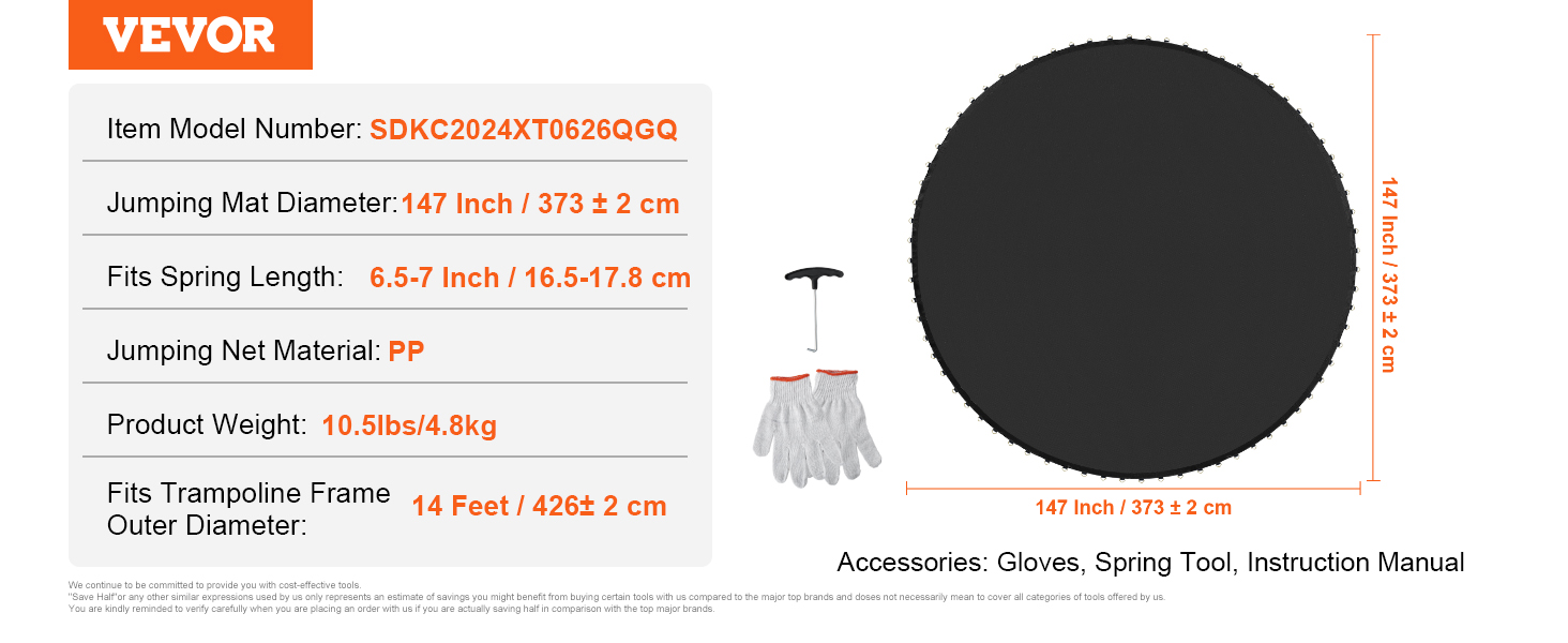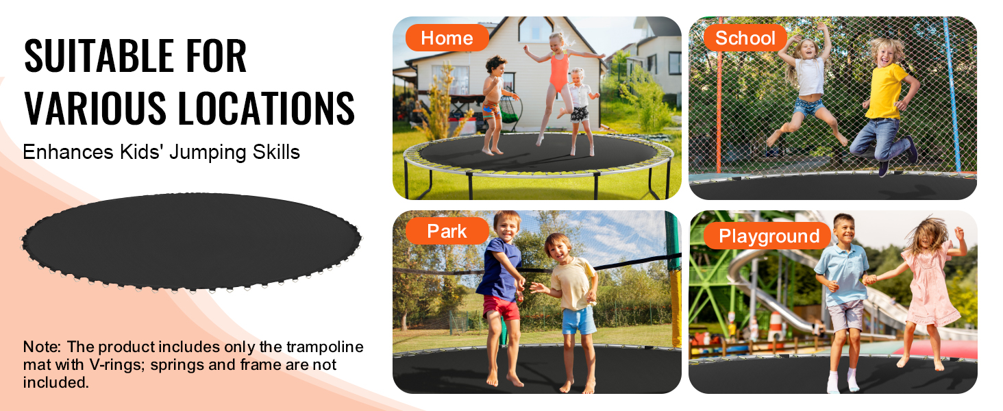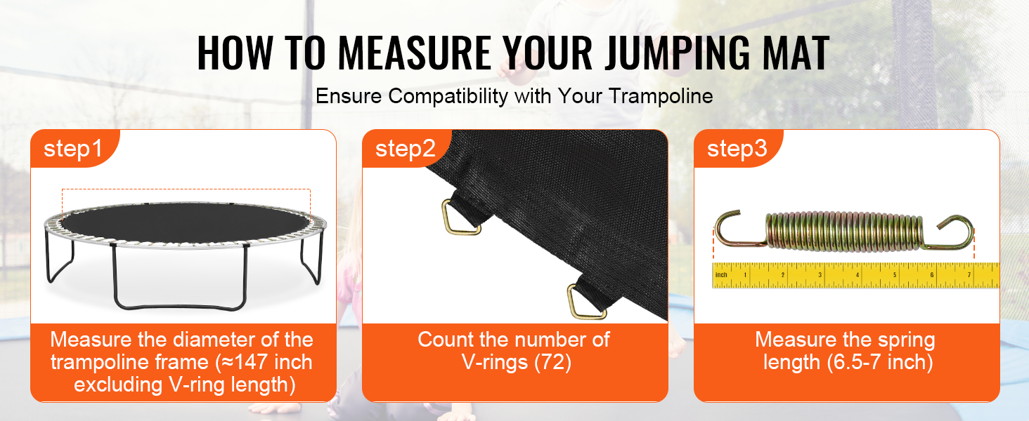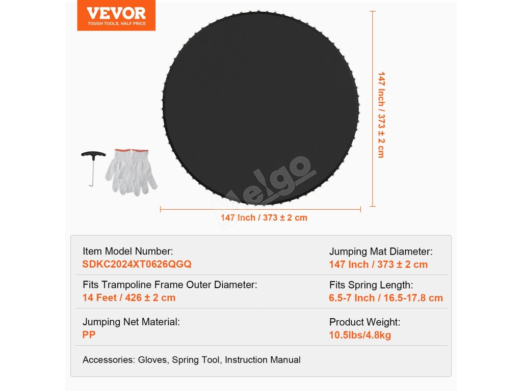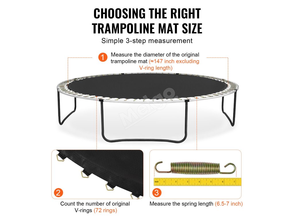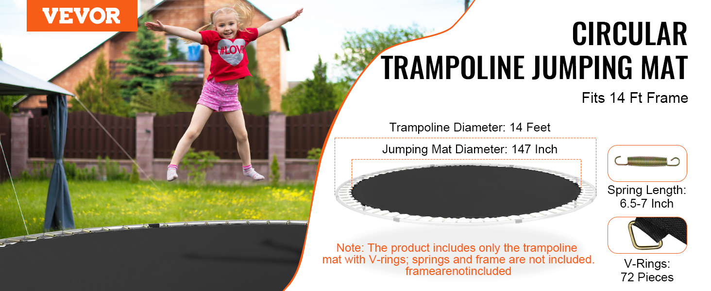 Vhodná pre okrúhle trampolíny s dĺžkou 14 stôp, so 72 V-krúžkami, s použitím 6,5-7 palcových pružín a priemerom rohože 147 palcov. Poznámka: Rám a pružiny nie sú súčasťou balenia.
