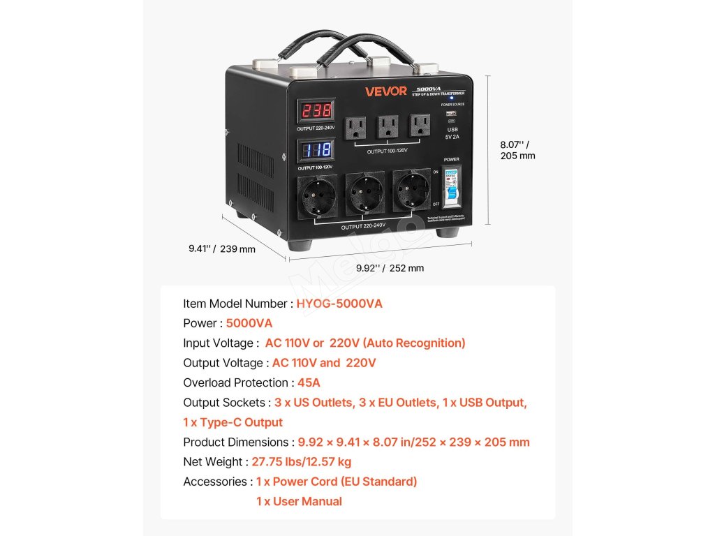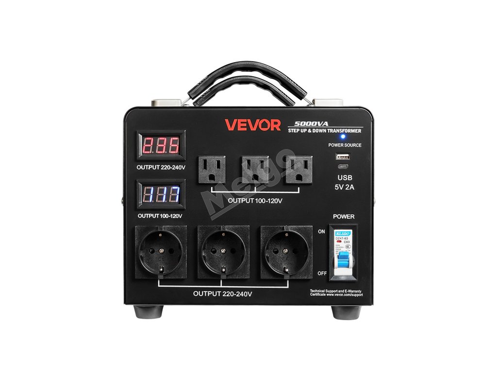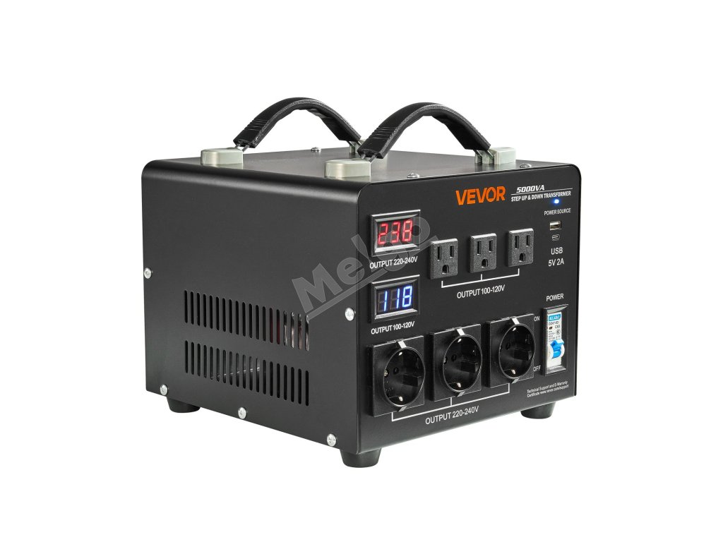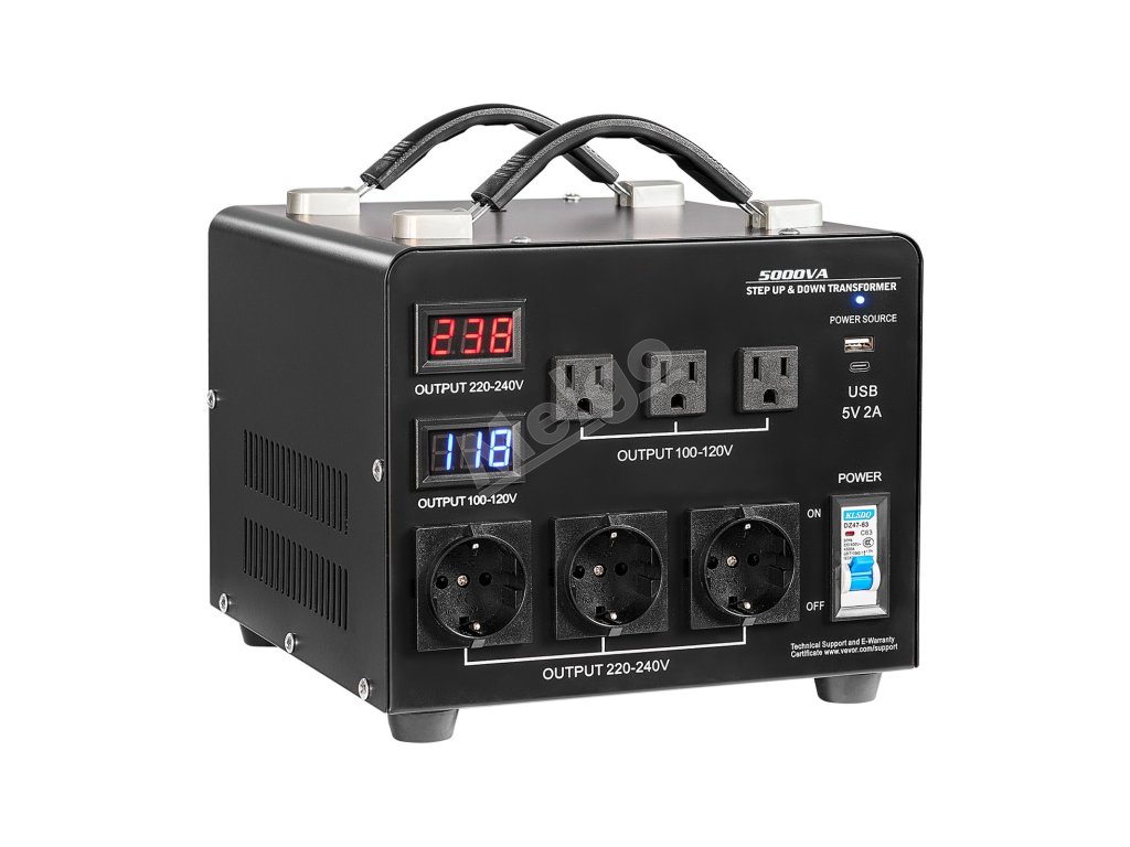 Napäťový transformátor 5000VA, 110/220V, 3×US/3×EU zásuvky, LCD, istič