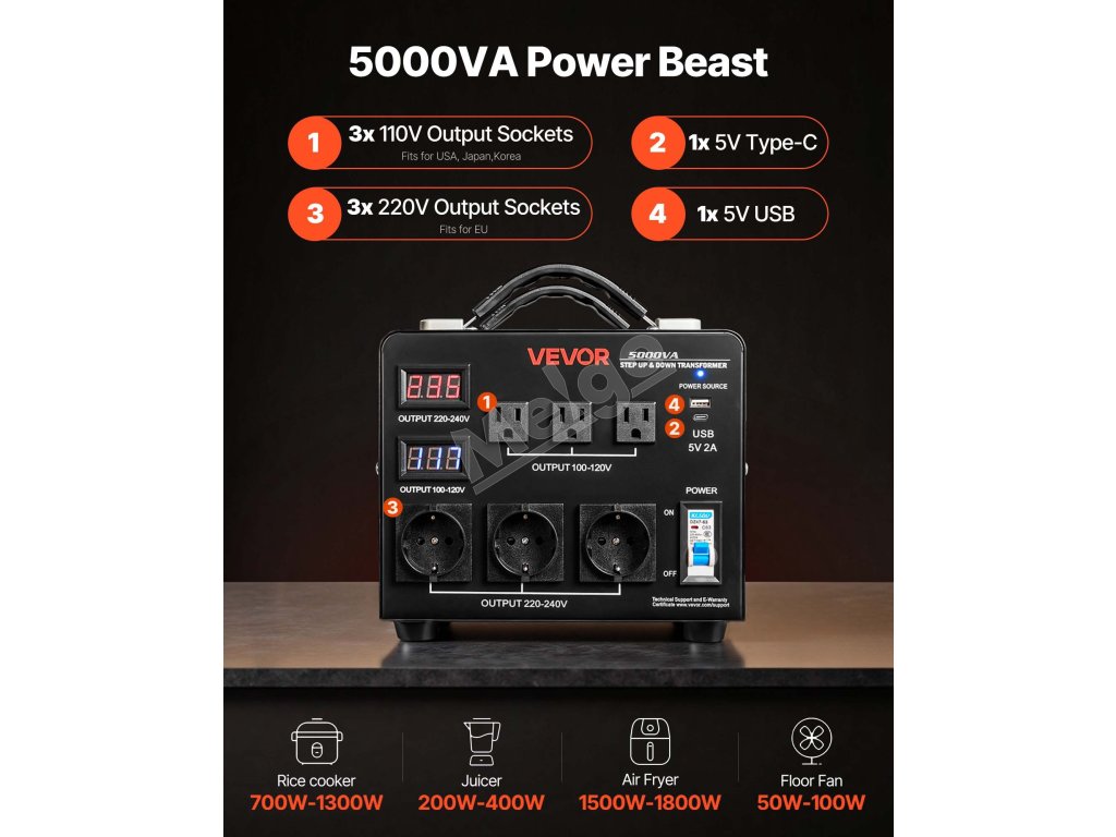 Už žiadna nekompatibilita napätia s dovážanými a zahraničnými zariadeniami. Automaticky rozpozná vstupné napätie a správne nastaví výstupné napätie. Obsahuje 3 štandardné výstupné zásuvky USA, 3 výstupné zásuvky EÚ, 1 výstup USB a 1 výstup typu C, vďaka čomu napája viacero zariadení naraz.