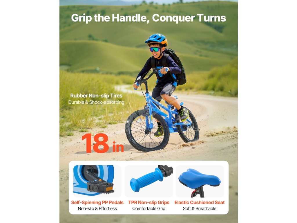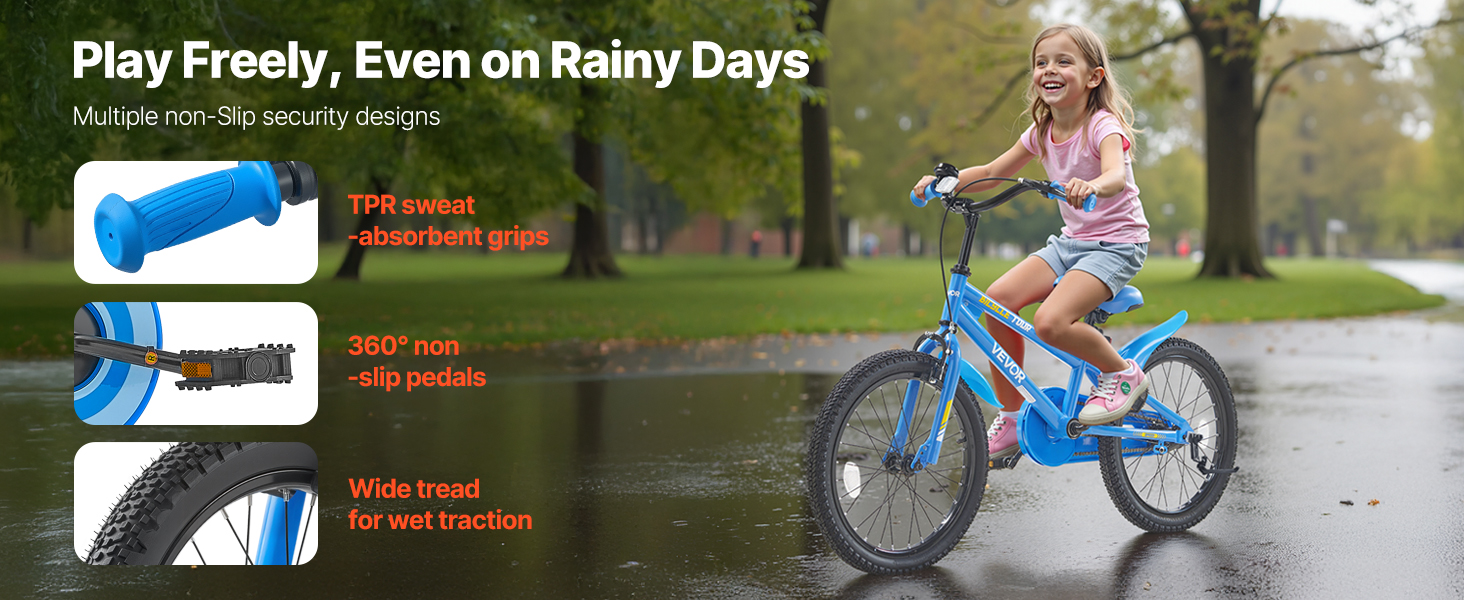 TPR rukoväte detského bicykla sú odolné voči potu a protišmykové. Samotočivé pedále a širšie pneumatiky si hravo poradia s kalužami, zatiaľ čo blatníky vás udržia v čistote a suchu!