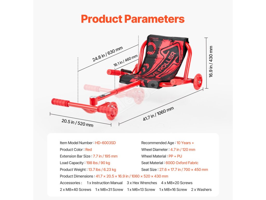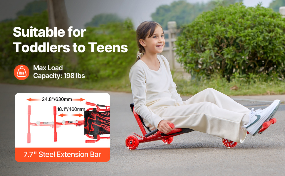 Náš driftovací vozík pre deti, vybavený 7,7-palcovou oceľovou predlžovacou tyčou, sa prispôsobí rôznym výškam a typom postavy, ako vaše dieťa rastie.