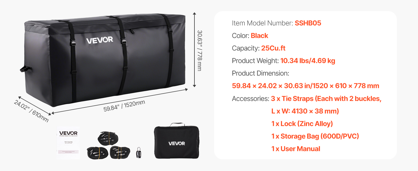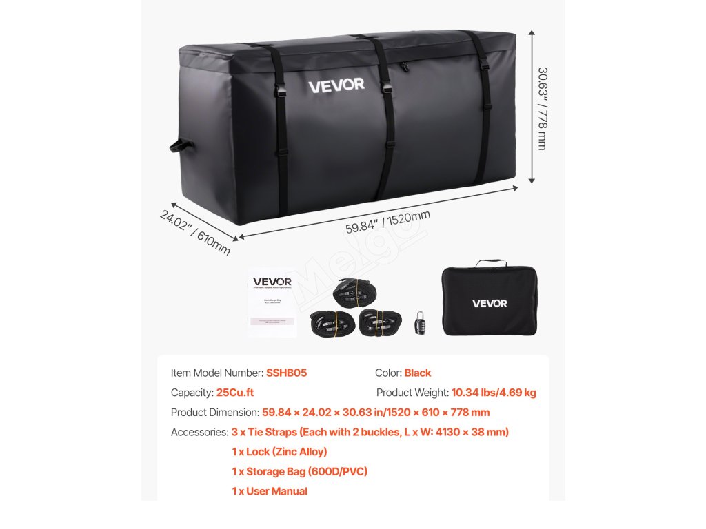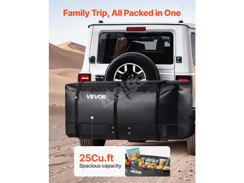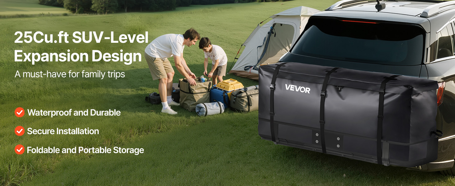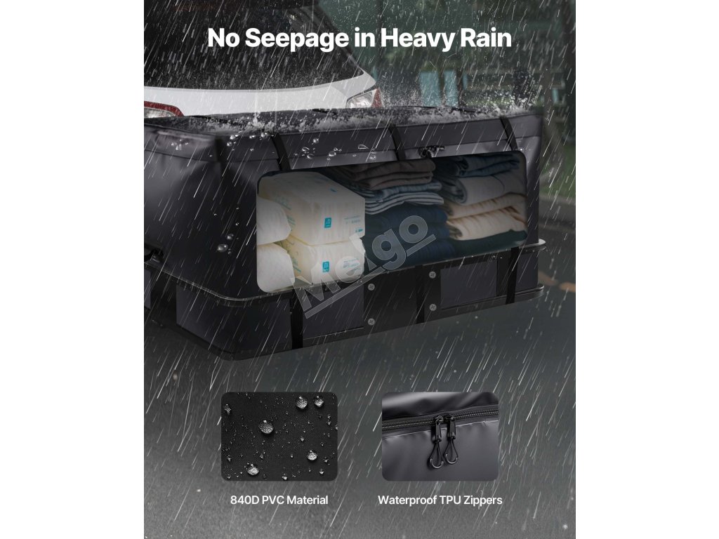 25 kubických stôp priestoru sa hodí na batožinu, stany, kočíky a ďalšie veci. Vodotesná vrstva a utesnené zipsy udržia predmety v suchu v daždi alebo snehu. Protišmykové popruhy zabezpečujú stabilitu počas jazdy. Skladá sa na kompaktné uskladnenie. Prispôsobený dizajn vám nebude brániť vo výhľade, čo zabezpečí pohodlné a jednoduché dochádzanie.