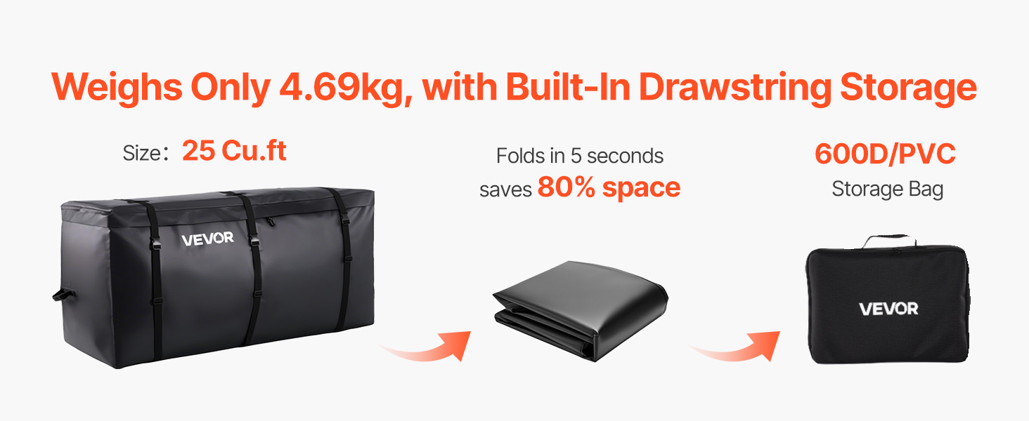 Táto taška na nosič nákladu na závesný vozík je ľahšia ako tradičné boxy na náklad a dá sa rýchlo rozložiť a nainštalovať, potom ľahko zložiť na uskladnenie, čím zaberie minimum miesta vo vašom aute.
