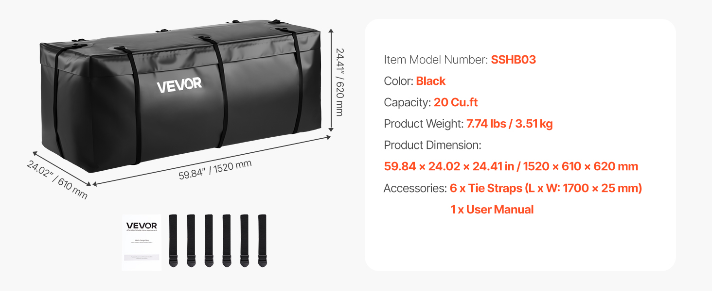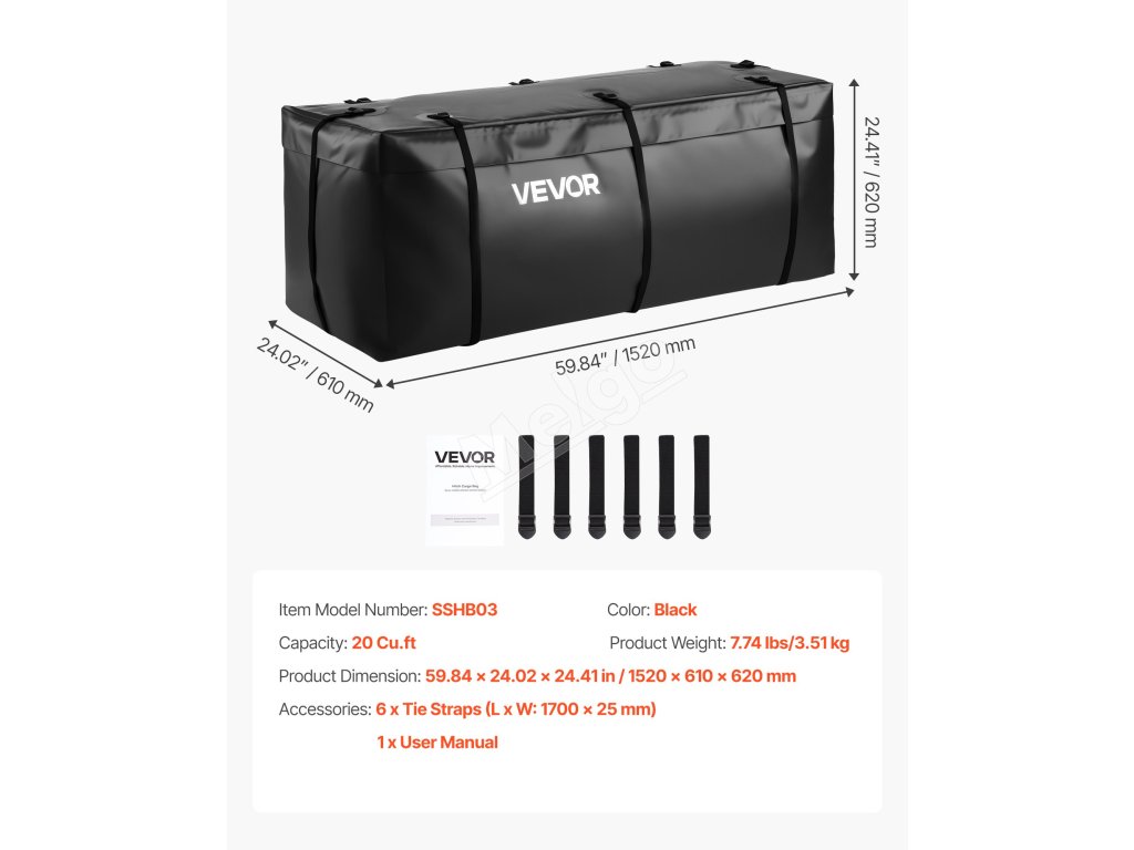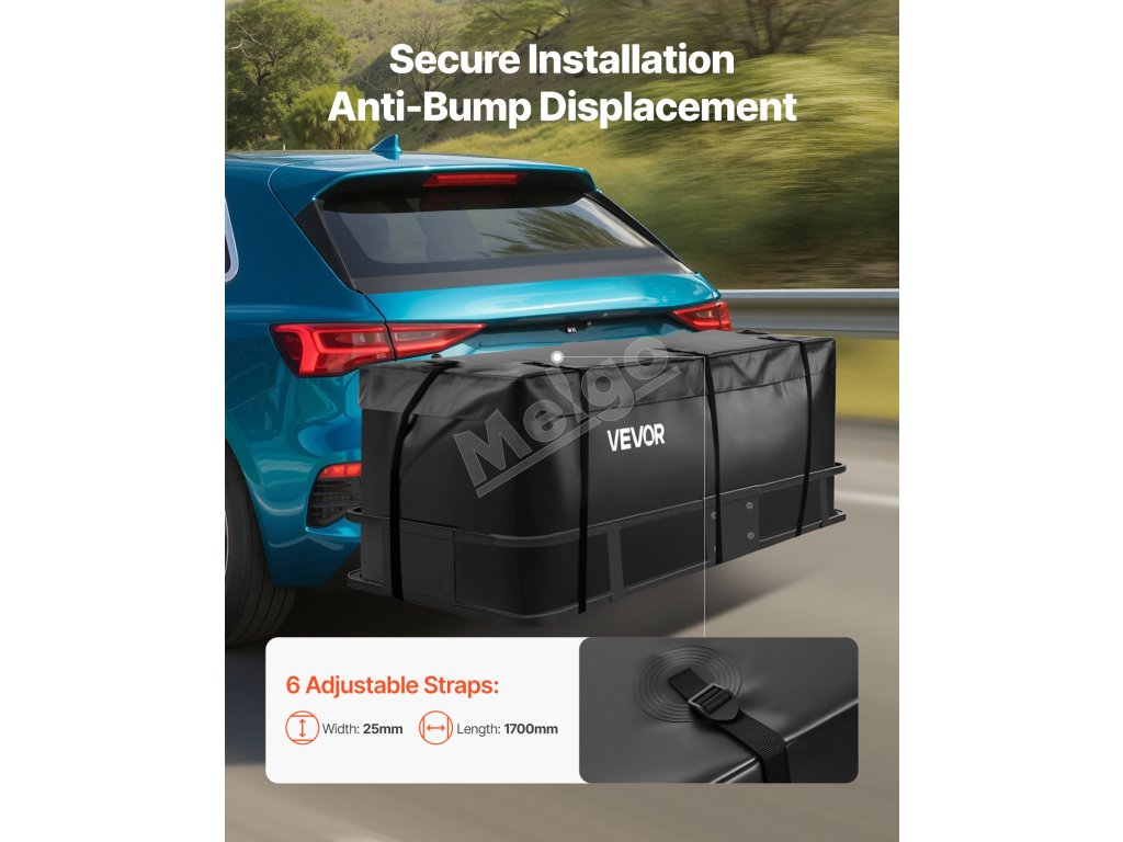 20 kubických stôp priestoru sa hodí na batožinu, stany, kočíky a ďalšie veci. Vodotesná vrstva a utesnené zipsy udržia predmety v suchu v daždi alebo snehu. Protišmykové popruhy zabezpečujú stabilitu počas jazdy. Skladá sa na kompaktné uskladnenie. Prispôsobený dizajn vám nebude brániť vo výhľade, čo zabezpečí pohodlné a jednoduché dochádzanie.
