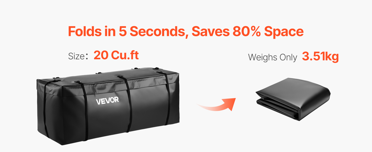 Táto taška na nosič nákladu na závesný vozík je ľahšia ako tradičné boxy na náklad a dá sa rýchlo rozložiť a nainštalovať, potom ľahko zložiť na uskladnenie, čím zaberie minimum miesta vo vašom aute.