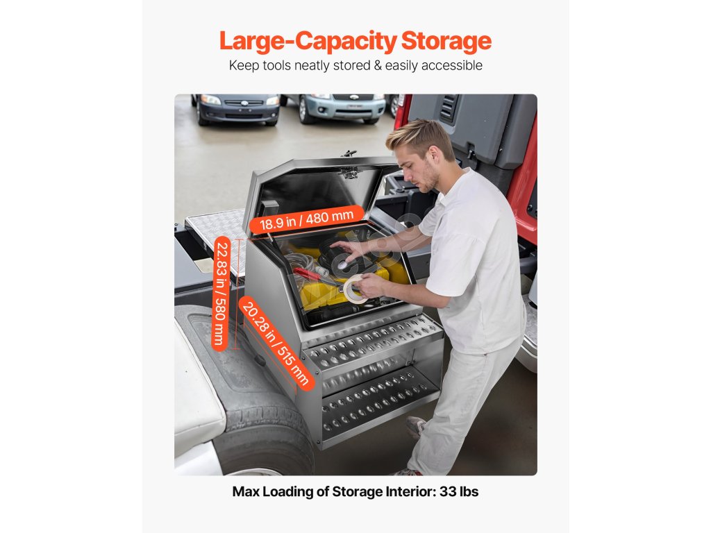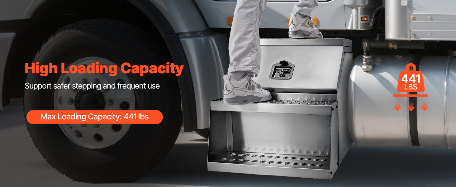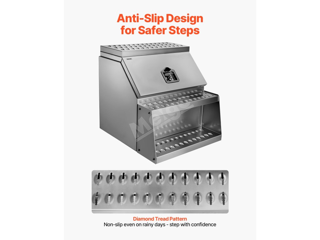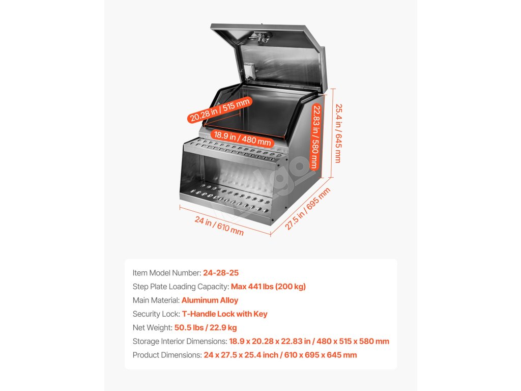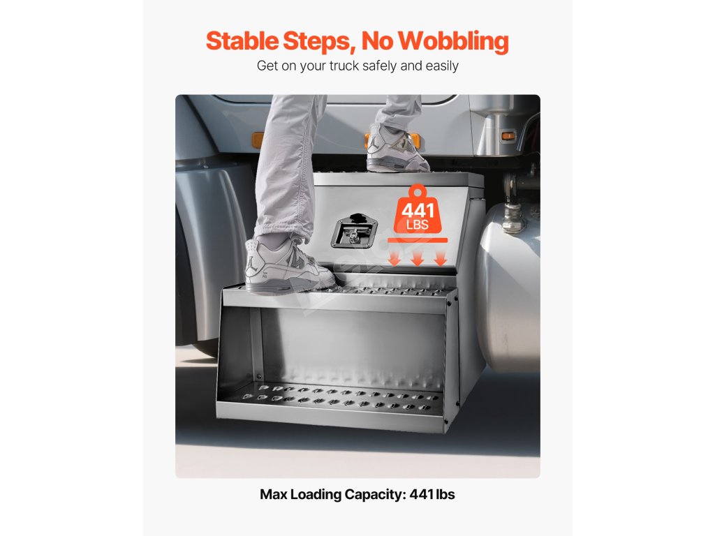 Skriňa na náradie VEVOR so schodíkmi pre polopásové vozidlá kombinuje odolnú konštrukciu, bezpečné schodíky a bezpečné skladovanie v jednom univerzálnom zariadení. Je vyrobený z vysokopevnostnej hliníkovej zliatiny, unesie až 200 kg, aby zabezpečil stabilný nástup a výstup vodičov, a má priestranný vnútorný priestor na odkladanie s uzamykaním a kľúčmi.
