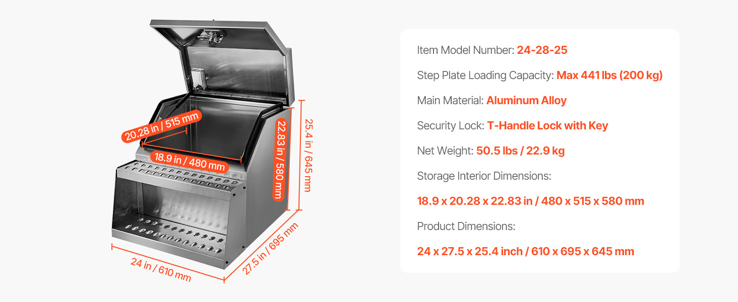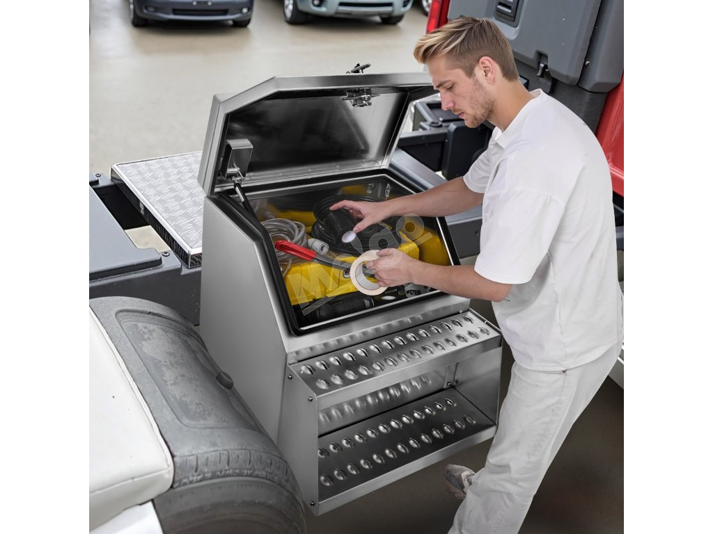 Tento hliníkový stupňovitý box na náradie s rozmermi 610 x 695 x 645 mm, skonštruovaný s 2 mm zosilnenými stupňovitými doskami a 3 mm zosilneným korpusom, ponúka robustnú konštrukciu odolnú proti deformácii a kývaniu, ktorá unesie zaťaženie až 200 kg.