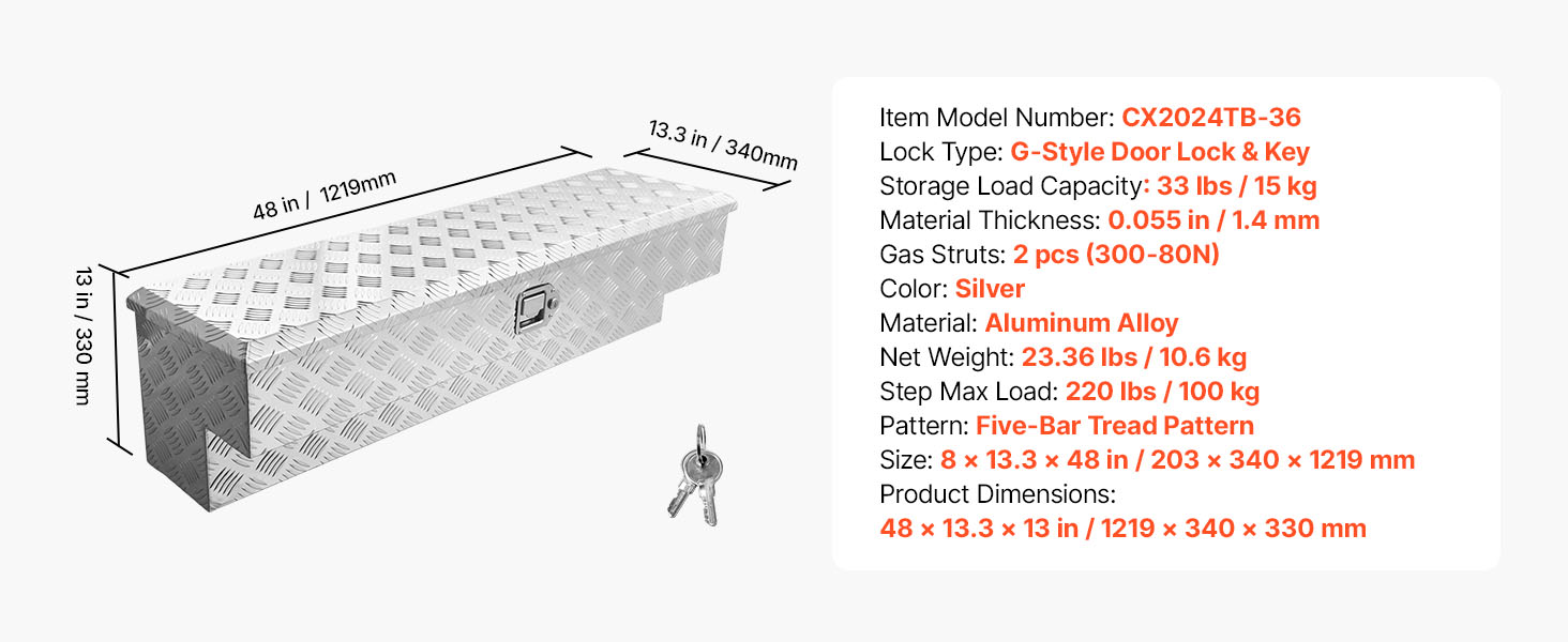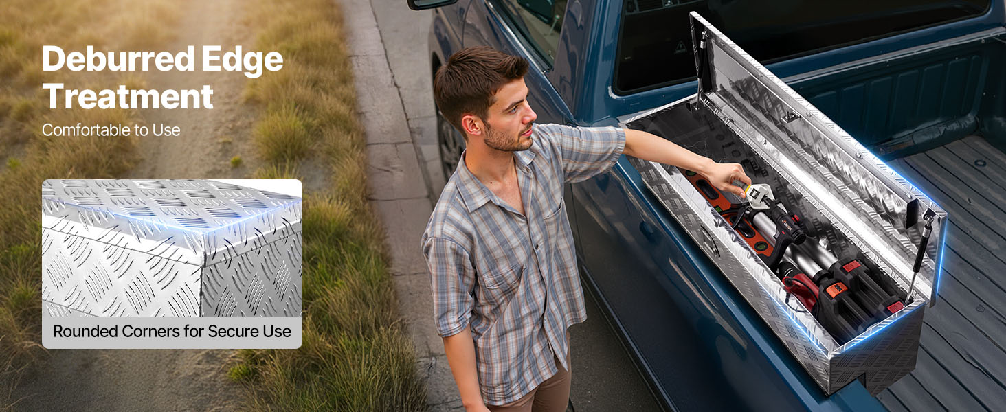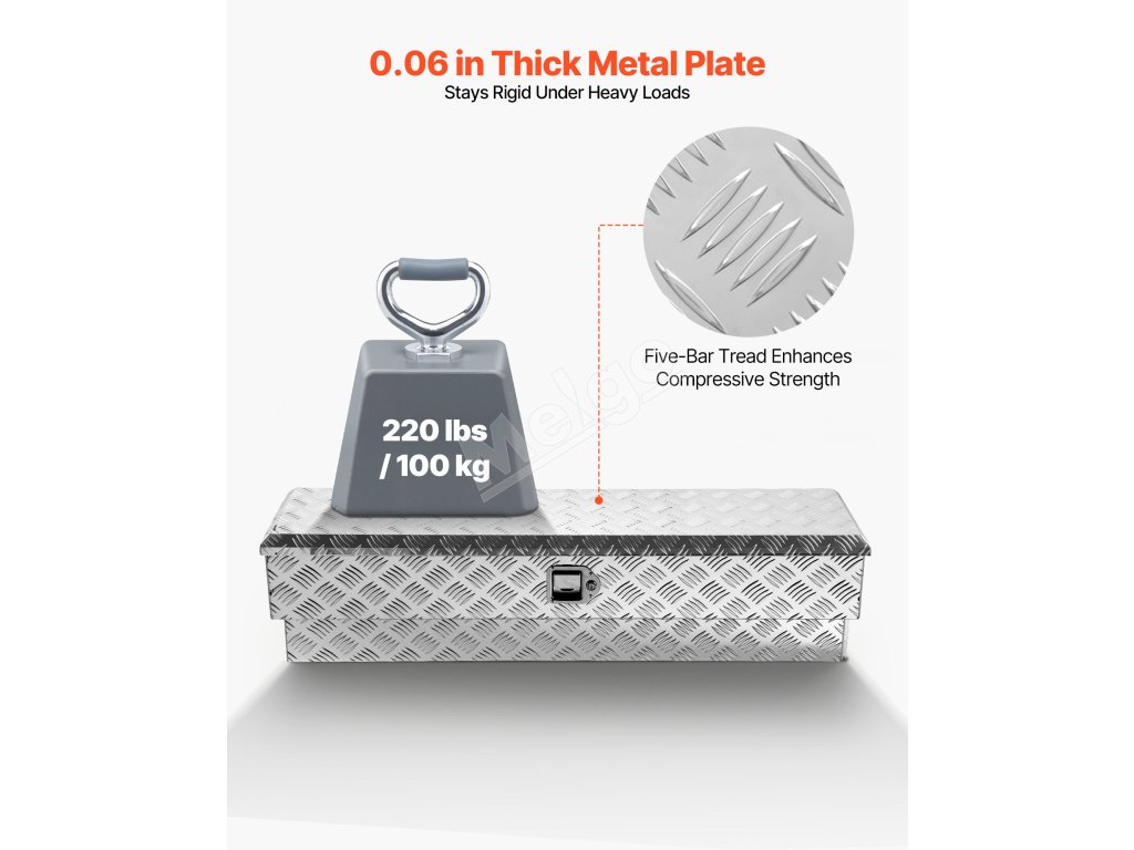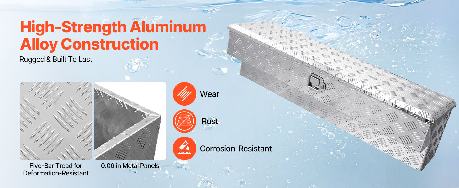 Tento box na náradie pre nákladné vozidlá je vyrobený z vystužených kovových panelov s hrúbkou 0,06 palca / 1,4 mm a rámu z vysokopevnostnej hliníkovej zliatiny so vzormi behúňov, čo zaručuje vynikajúcu odolnosť proti opotrebovaniu, hrdzi a korózii a zaručuje dlhodobé používanie.