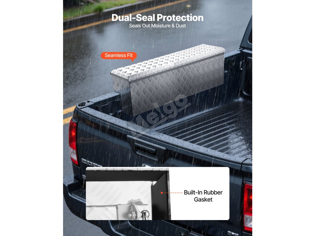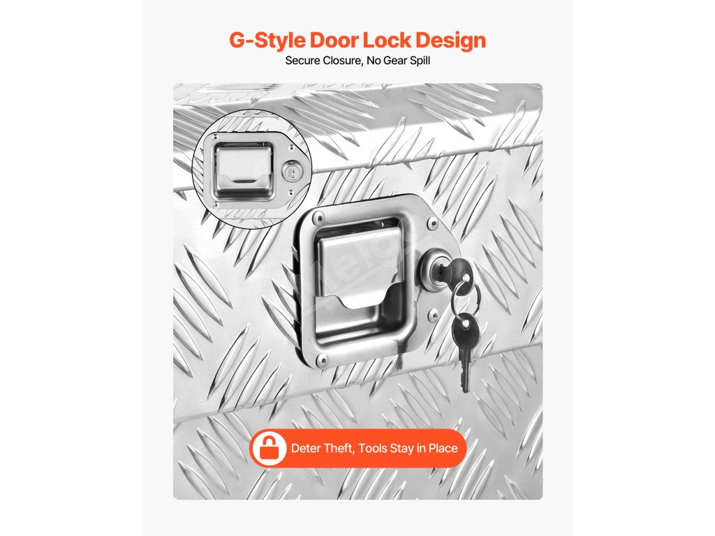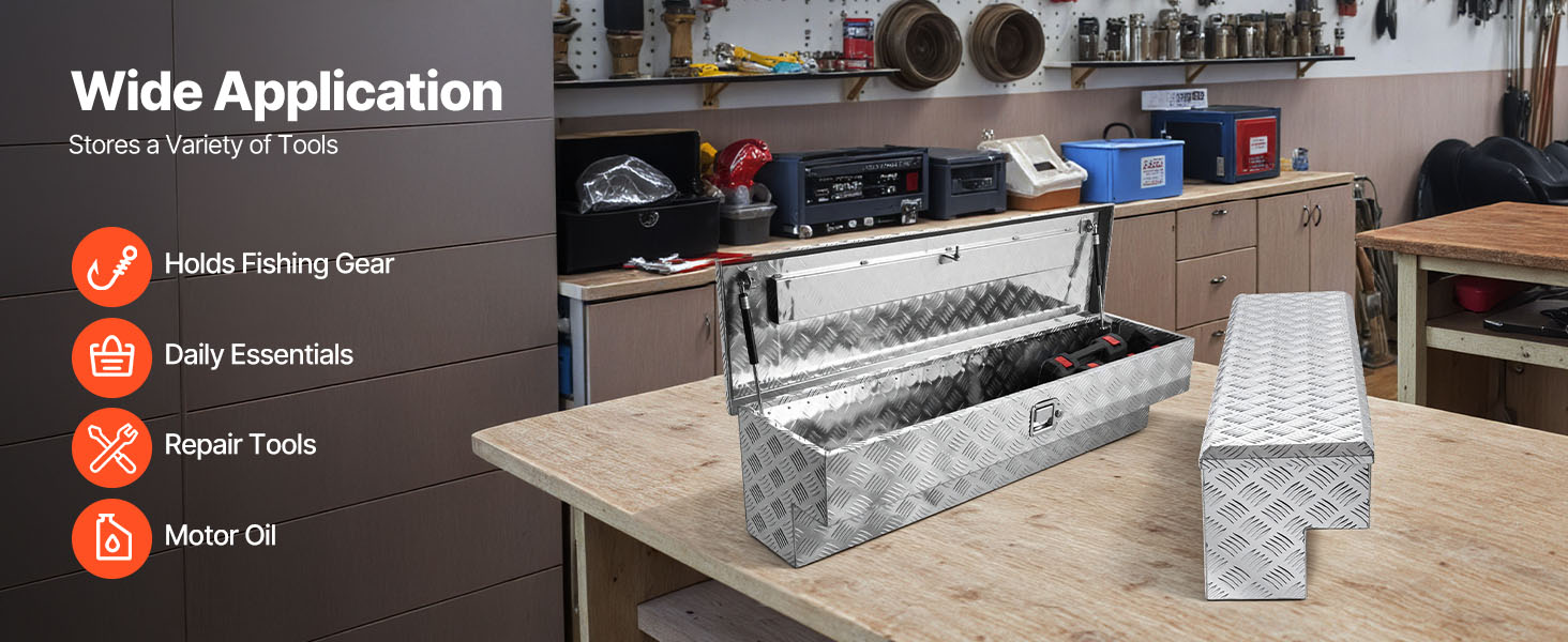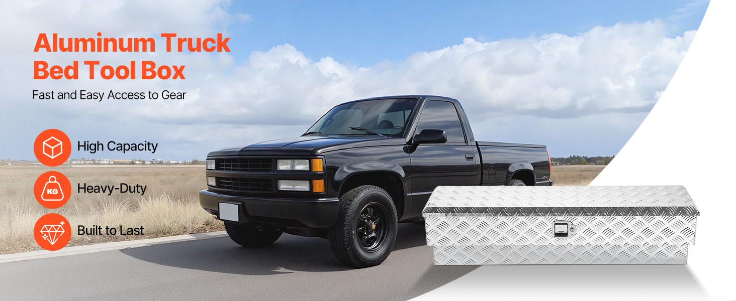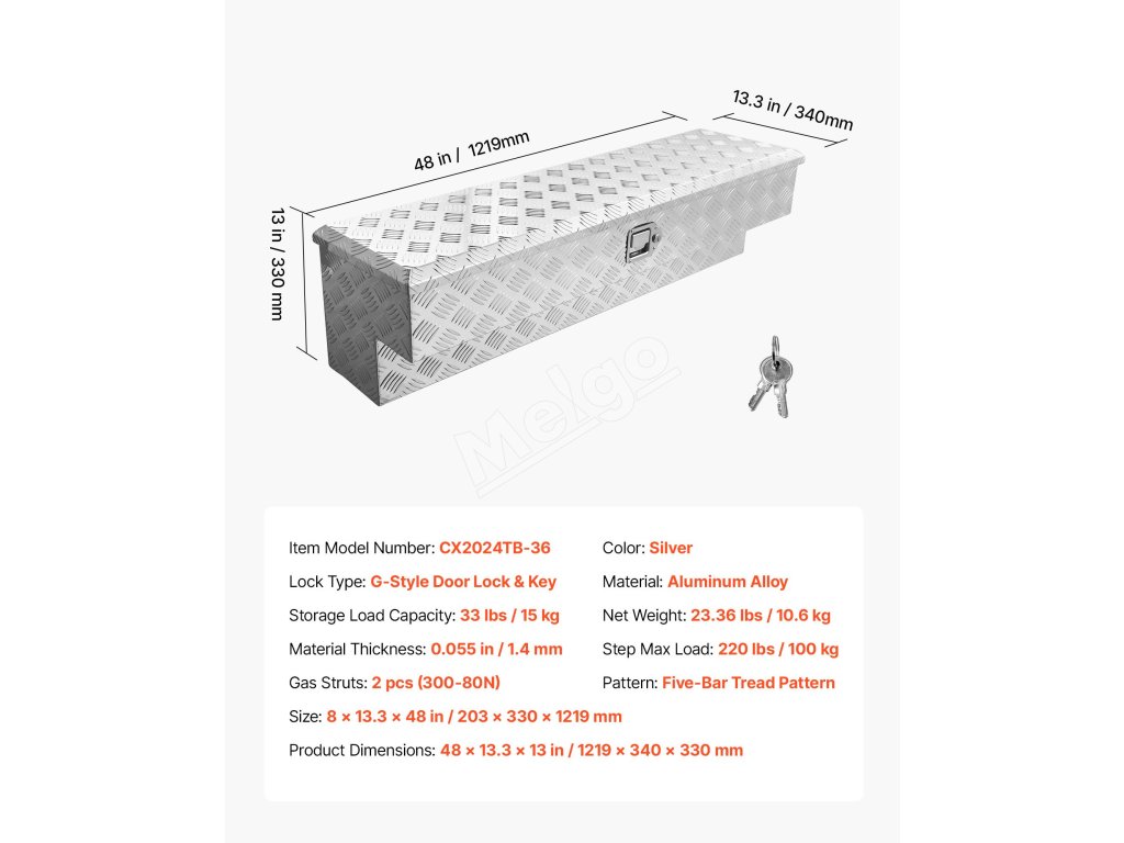 Tento box na náradie pre nákladné vozidlá je vyrobený z vystužených kovových panelov s hrúbkou 0,06 palca / 1,4 mm a rámu z vysokopevnostnej hliníkovej zliatiny so vzormi behúňov, čo zaručuje vynikajúcu odolnosť proti opotrebovaniu, hrdzi a korózii a zaručuje dlhodobé používanie.