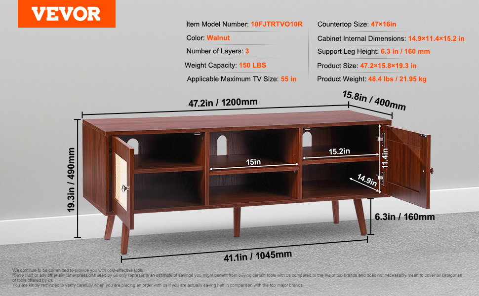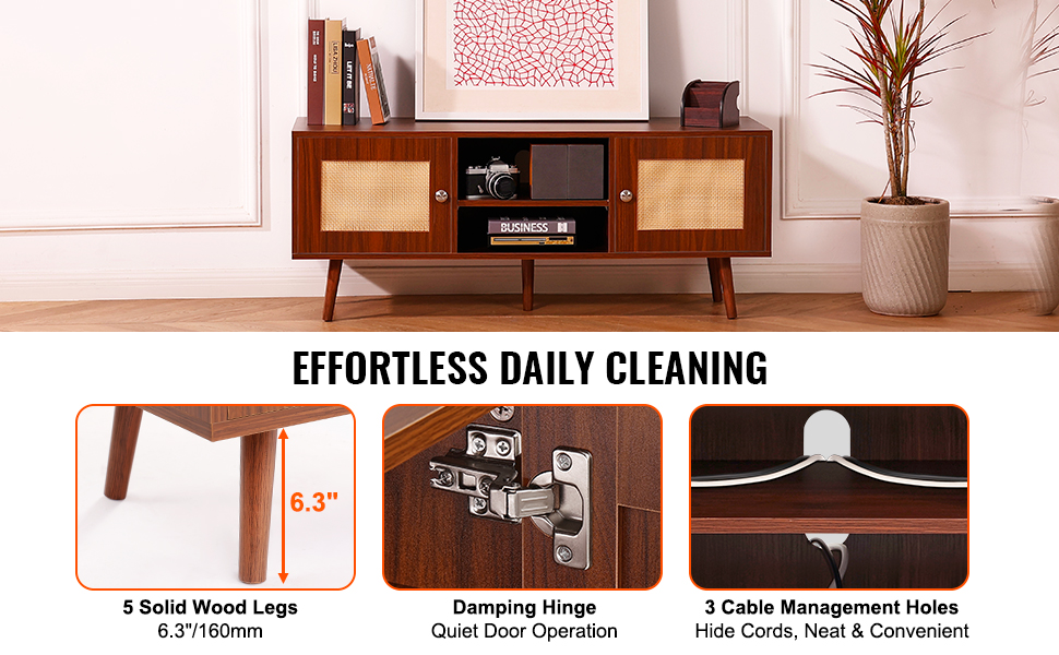 Nohy z masívneho dreva s výškou 6,3" zabezpečujú dostatočný priestor medzi boho TV stojanom a podlahou, čo umožňuje prechod robotického vysávača. Tri otvory na vedenie káblov udržiavajú káble v poriadku a tlmiče na pántoch zabezpečujú tiché zatváranie dvierok.