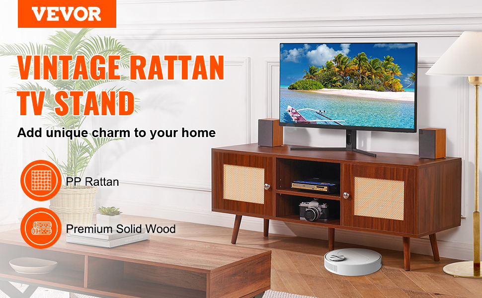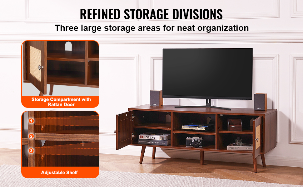 Obsahuje veľké ratanové úložné skrinky na oboch stranách pre súkromie a organizáciu. Stredná otvorená polica má nastaviteľnú výšku od 0 do 64 mm a poskytuje vhodný úložný priestor na DVD, audio zariadenia, CD a knihy.