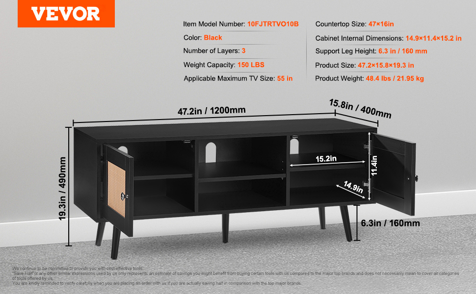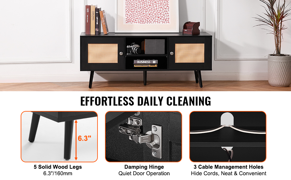 Nohy z masívneho dreva s výškou 6,3" zabezpečujú dostatočný priestor medzi boho TV stojanom a podlahou, čo umožňuje prejazd robotického vysávača. Tri otvory na vedenie káblov udržiavajú káble v poriadku a tlmiče na pántoch zabezpečujú tiché zatváranie dvierok.