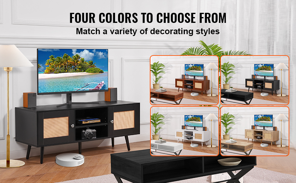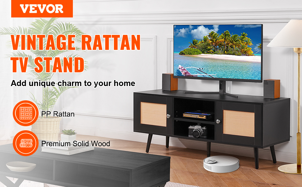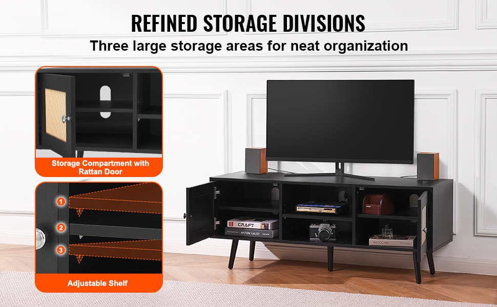 Obsahuje veľké ratanové úložné skrinky na oboch stranách pre súkromie a organizáciu. Stredná otvorená polica má nastaviteľnú výšku od 0 do 64 mm a poskytuje vhodný úložný priestor na DVD, audio zariadenia, CD a knihy.