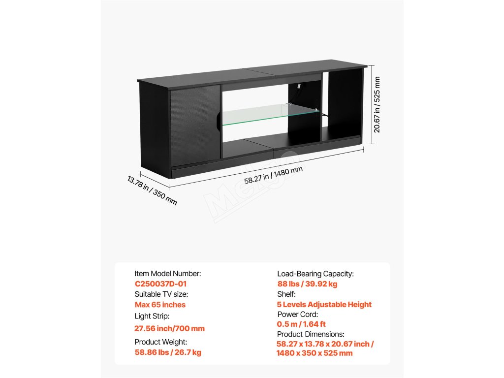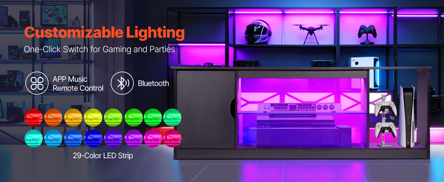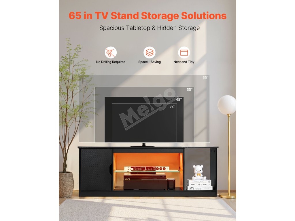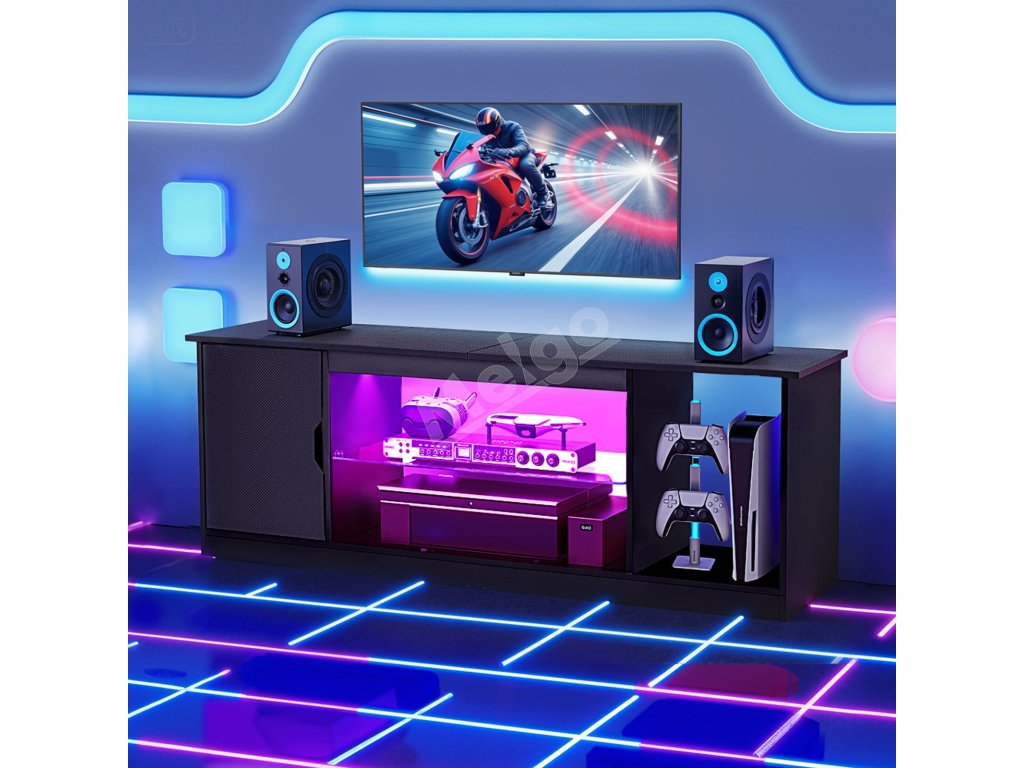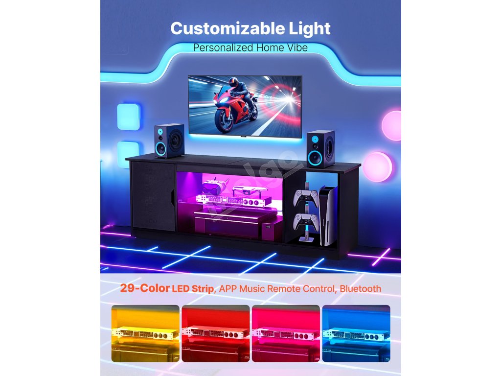 Televízny stojan, vybavený svetelnými LED pásmi, možno ovládať pomocou priloženého diaľkového ovládača alebo aplikácie, ktorá ponúka režimy, ako je synchronizácia hudby, časovanie, nastavenie rýchlosti a ovládanie jasu. Ľahko prepínajte medzi dennými, nočnými alebo slávnostnými motívmi a vytvorte tak ideálnu atmosféru zábavy.