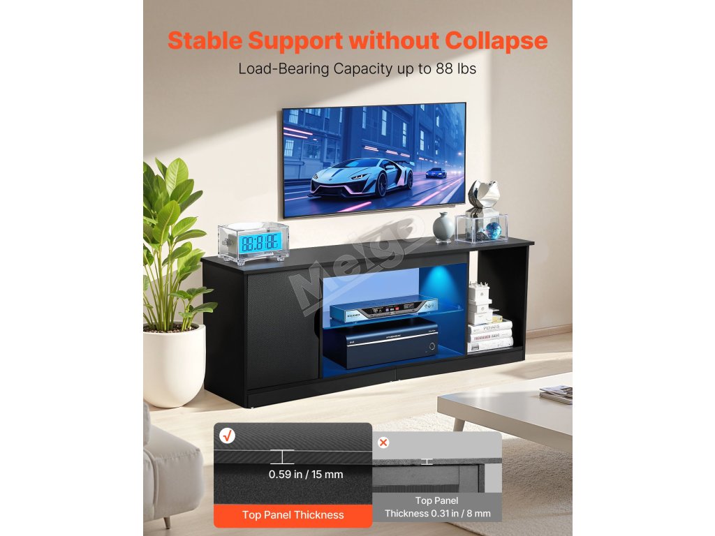 Vyrobené z prvotriednej drevotrieskovej dosky a tvrdeného skla pre dlhú životnosť: police s hrúbkou 0,59 palca / 15 mm + rám z drevotrieskovej dosky P2 zaisťujú stabilitu. Nosnosť: 88 libier / 39,92 kg, bezpečne udrží váš televízor a zariadenia s istotou.