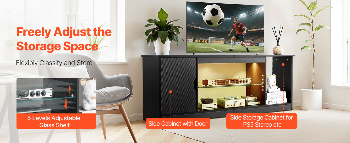 Nastaviteľné otvorené police dokážu flexibilne pojať herné konzoly, reproduktory, set-top boxy a ďalšie zariadenia rôznych veľkostí, čím zabezpečia nastavenie prispôsobené vašim potrebám v oblasti zábavy.