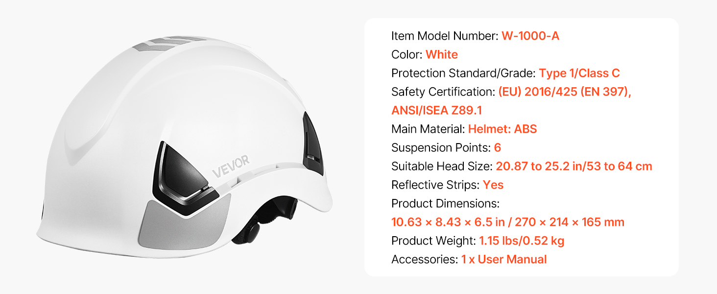 Bezpečnostná prilba s certifikáciou ANSI/ISEA Z89.1 má pevnú, ale ľahkú škrupinu z ABS, ktorá chráni pred nárazmi a elektrickým prúdom. Šesťbodové zavesenie s ráčnovým gombíkom je vhodné pre veľkosti 20,87 až 25,2 palca/53 až 64 cm a poskytuje priedušné, bezpečné a pohodlné nosenie počas celého dňa.