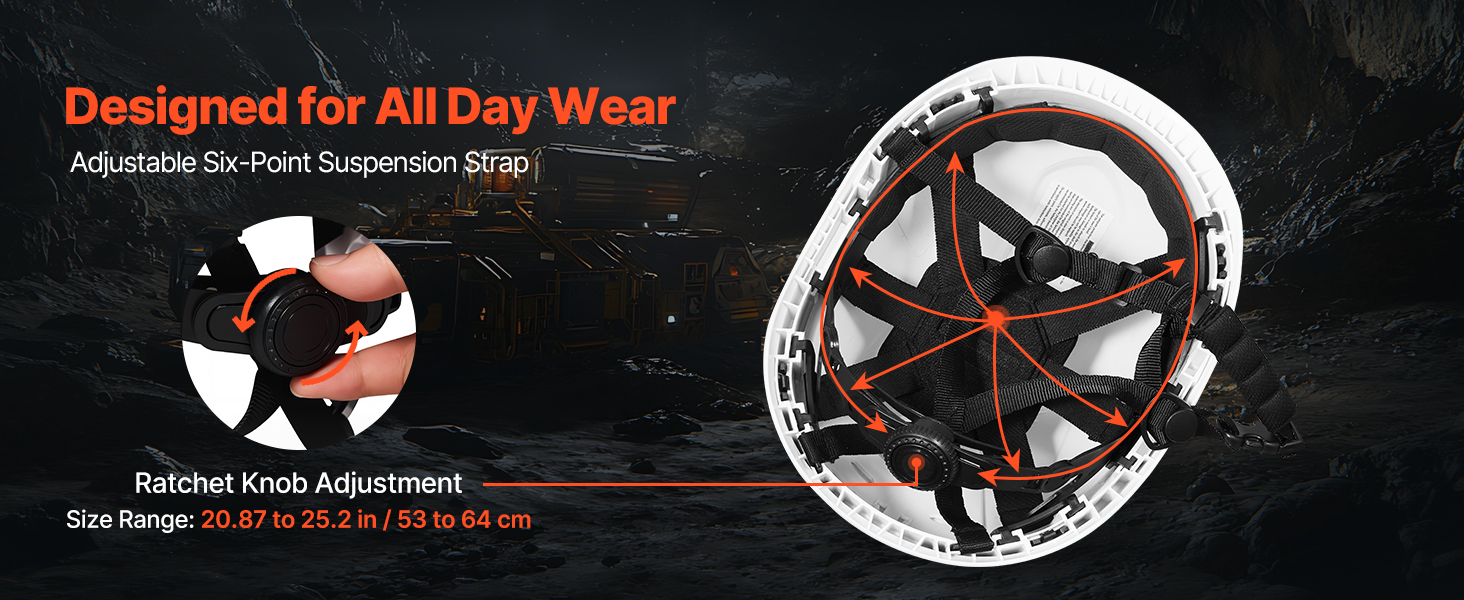 Zostaňte v pohodlí po celý deň vďaka 6-bodovému zaveseniu a ľahko otočnému západkovému gombíku. Naša prilba s tvrdým klobúkom sa plynule nastavuje tak, aby sa prispôsobila veľkosti hlavy 20,87 až 25,2 palca/53 až 64 cm, čo zaručuje priliehavý a stabilný pocit pri každej práci.
