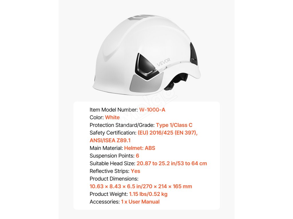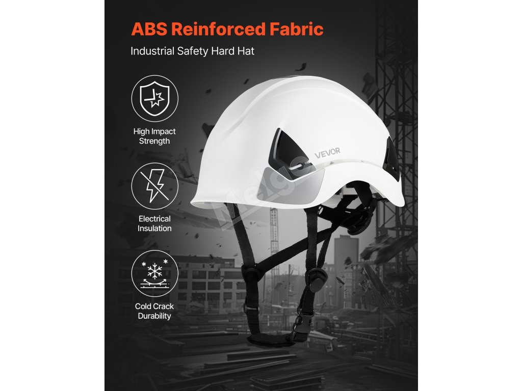 Bezpečnostná prilba s certifikáciou ANSI/ISEA Z89.1 má pevnú, ale ľahkú škrupinu z ABS, ktorá chráni pred nárazmi a elektrickým prúdom. Šesťbodové zavesenie s ráčnovým gombíkom je vhodné pre veľkosti 20,87 až 25,2 palca/53 až 64 cm a poskytuje priedušné, bezpečné a pohodlné nosenie počas celého dňa.