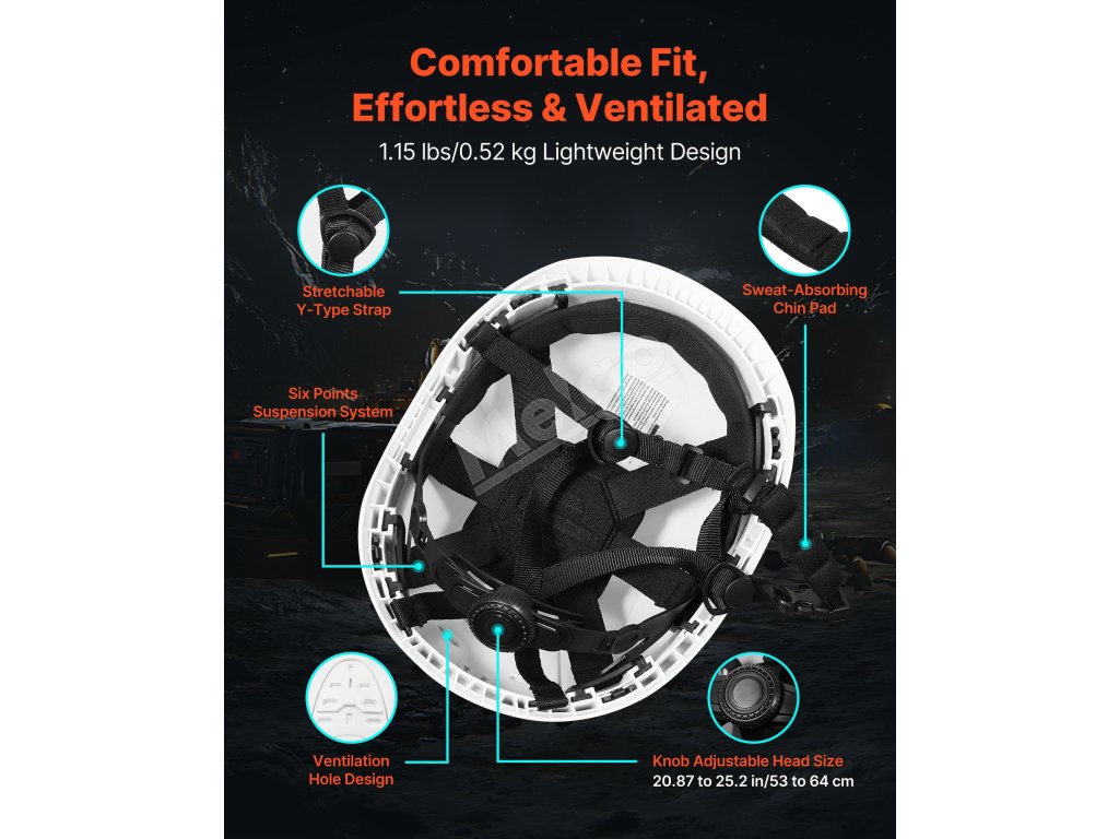 Zostaňte v pohodlí po celý deň vďaka 6-bodovému zaveseniu a ľahko otočnému západkovému gombíku. Naša prilba s tvrdým klobúkom sa plynule nastavuje tak, aby sa prispôsobila veľkosti hlavy 20,87 až 25,2 palca/53 až 64 cm, čo zaručuje priliehavý a stabilný pocit pri každej práci.