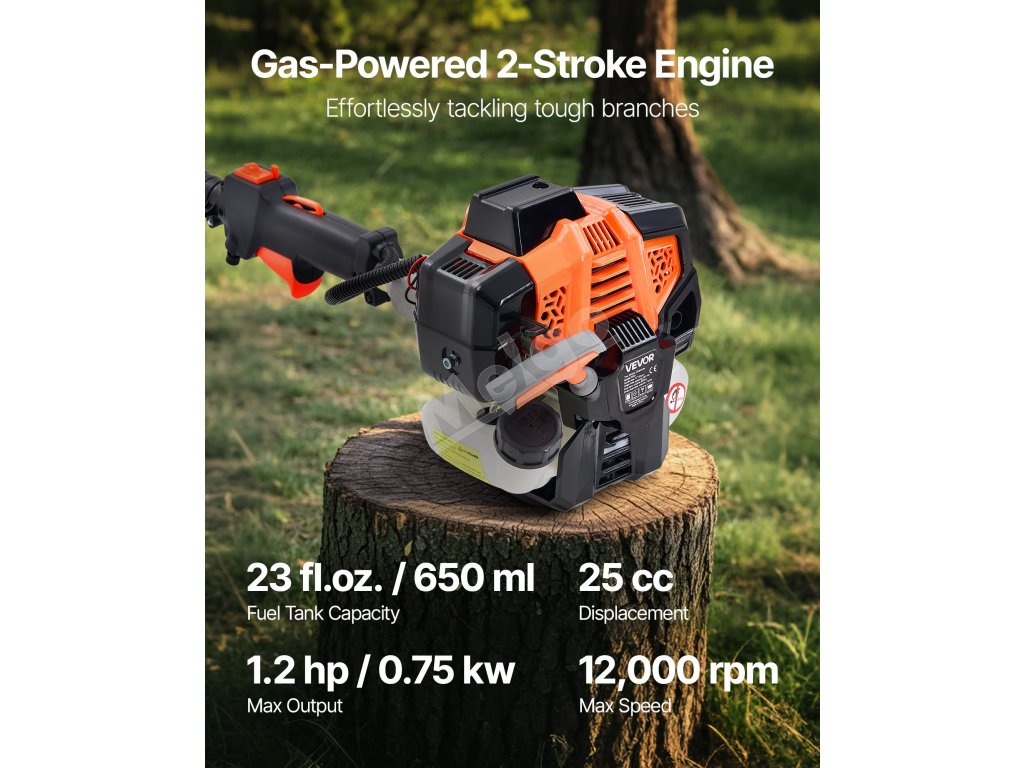 Plynová tyčová píla vybavená 2-taktným benzínovým motorom s objemom 25 cm3 poskytuje výkon 0,75 kW a dosahuje až 12 000 otáčok za minútu v spojení s 8" (20,3 cm) vodiacou lištou na rýchle a efektívne rezanie. Nemusíte sa starať o dĺžku kábla alebo výdrž batérie, pre vyššiu účinnosť rezania a stabilnú prevádzku.