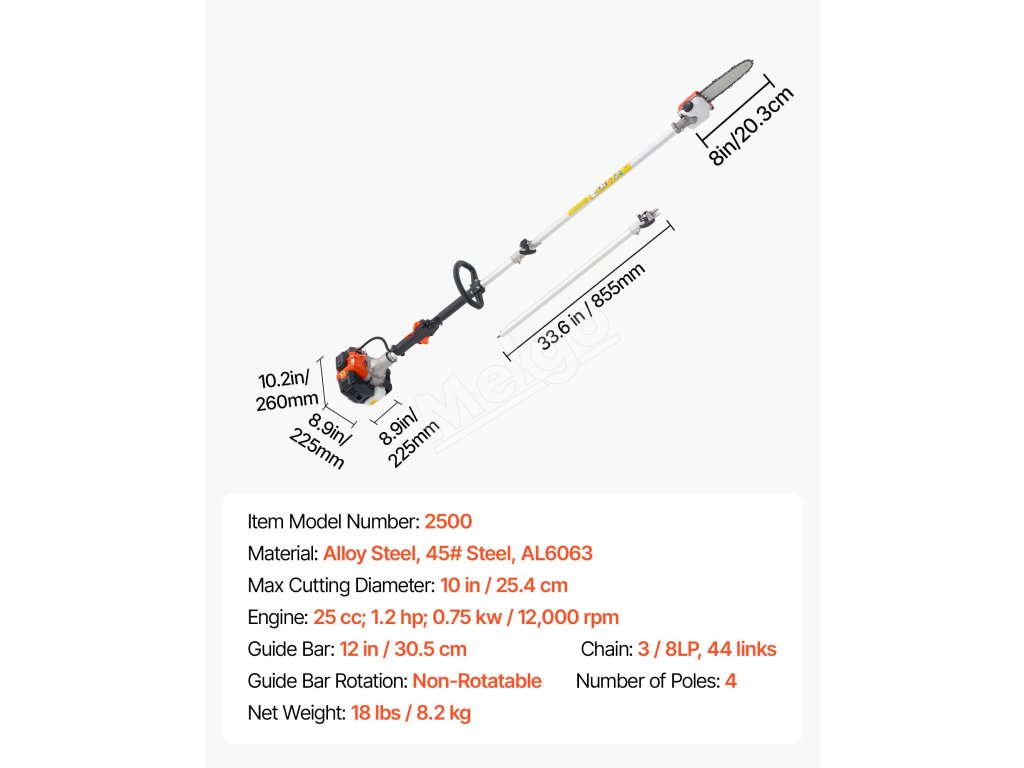 Táto benzínová píla na stĺpy je určená na vonkajšie prerezávanie a úpravu terénu a je vybavená vysoko výkonným 2-taktným benzínovým motorom, ktorý poskytuje silný výkon s jednoduchým štartovaním. Reťazová píla s priemerom 8"/20,3 cm zaručuje plynulé rezanie a vďaka akumulátorovej konštrukcii ľahko dosiahnete na vysoké konáre.