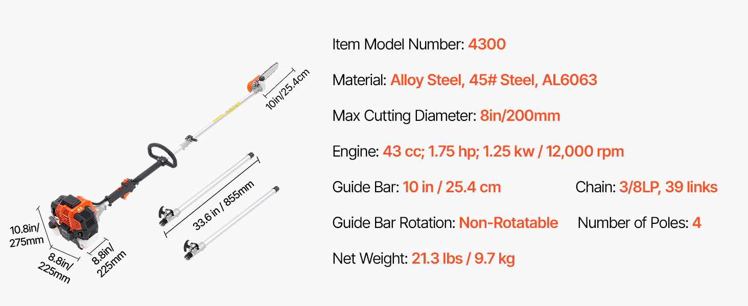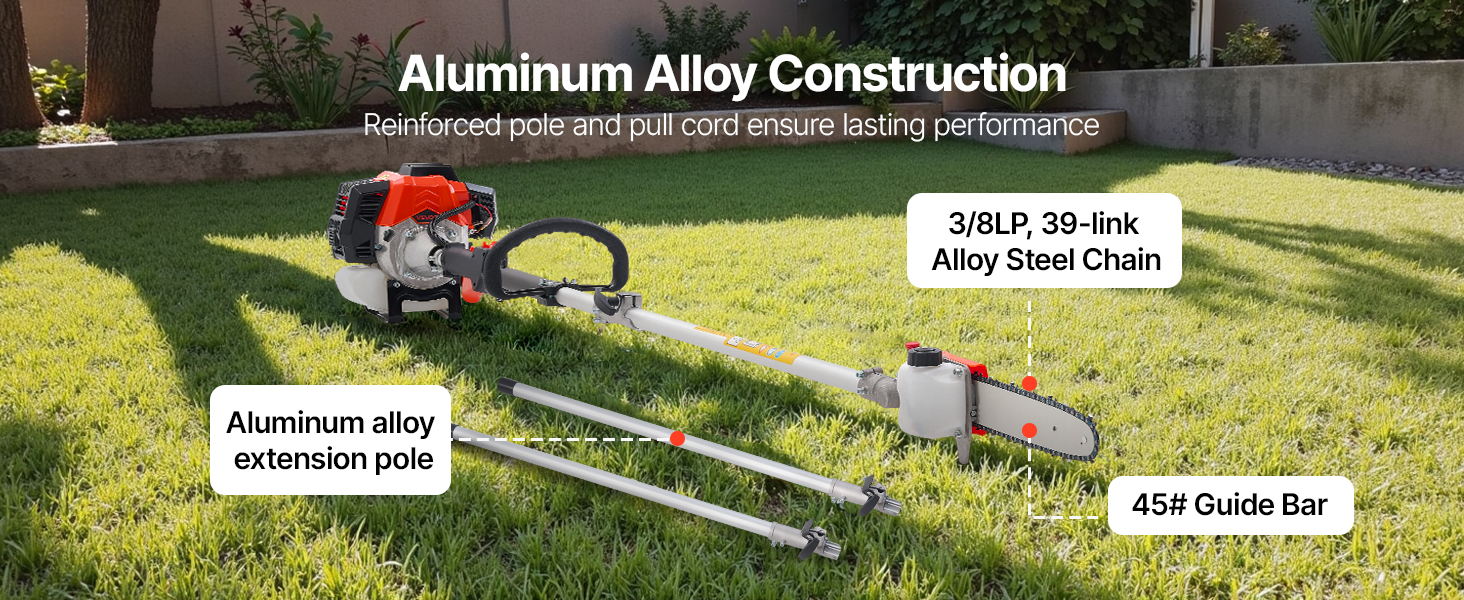 Tyč je vyrobená z hliníkovej zliatiny odolnej proti korózii, ktorá je vhodná do všetkých poveternostných podmienok. Oceľová vodiaca lišta a reťaz sú konštruované tak, aby vydržali, čím sa znižuje frekvencia výmeny, čím sa šetrí čas aj peniaze. Bezpečnosť zaisťuje viacúhlová nastaviteľná rezná hlava.