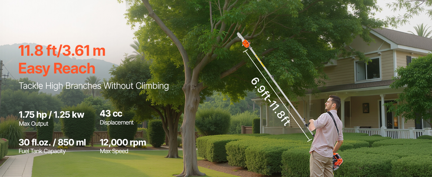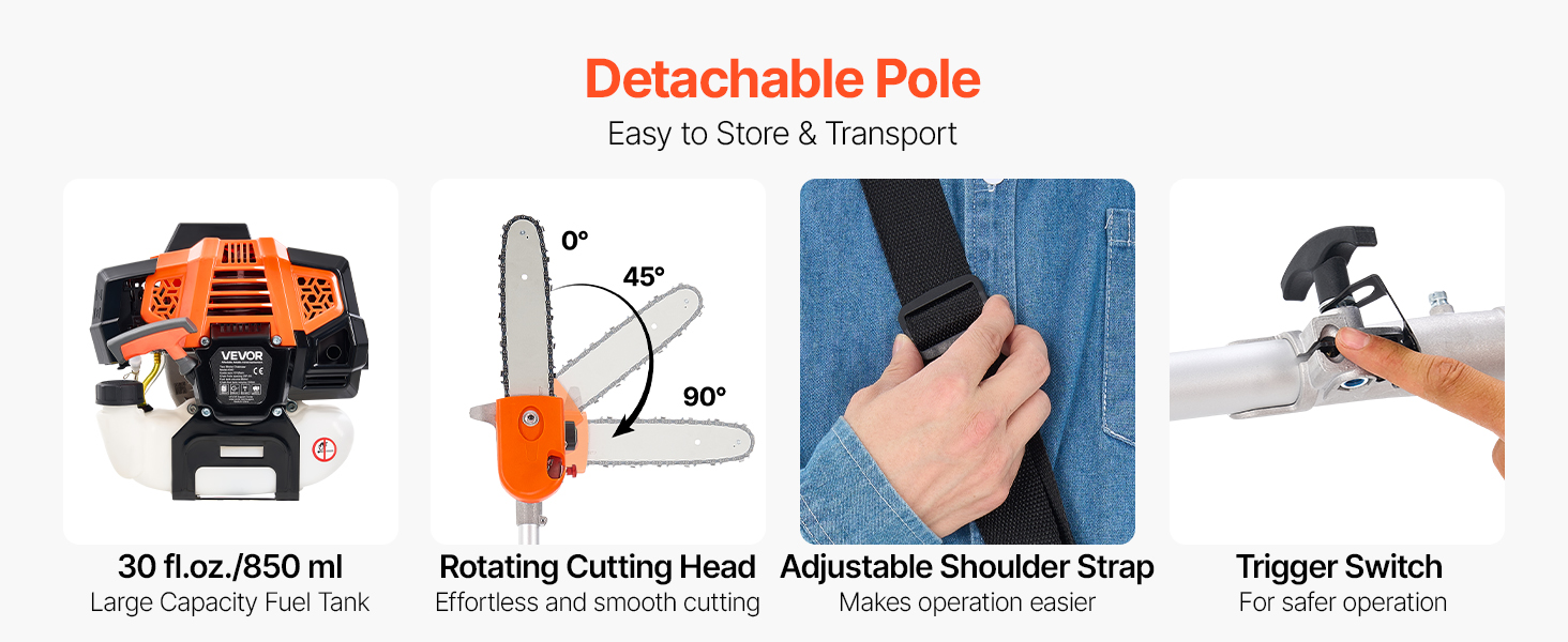 Reťazová píla na tyči má ergonomický dizajn vrátane pohodlného ramenného popruhu a mäkkej rukoväte, aby sa minimalizovala únava počas dlhšieho používania. Výsuvná tyč uľahčuje skladovanie a prenášanie. Veľkokapacitná palivová nádrž a funkcia automatického mazania zabezpečujú bezproblémovú prevádzku.