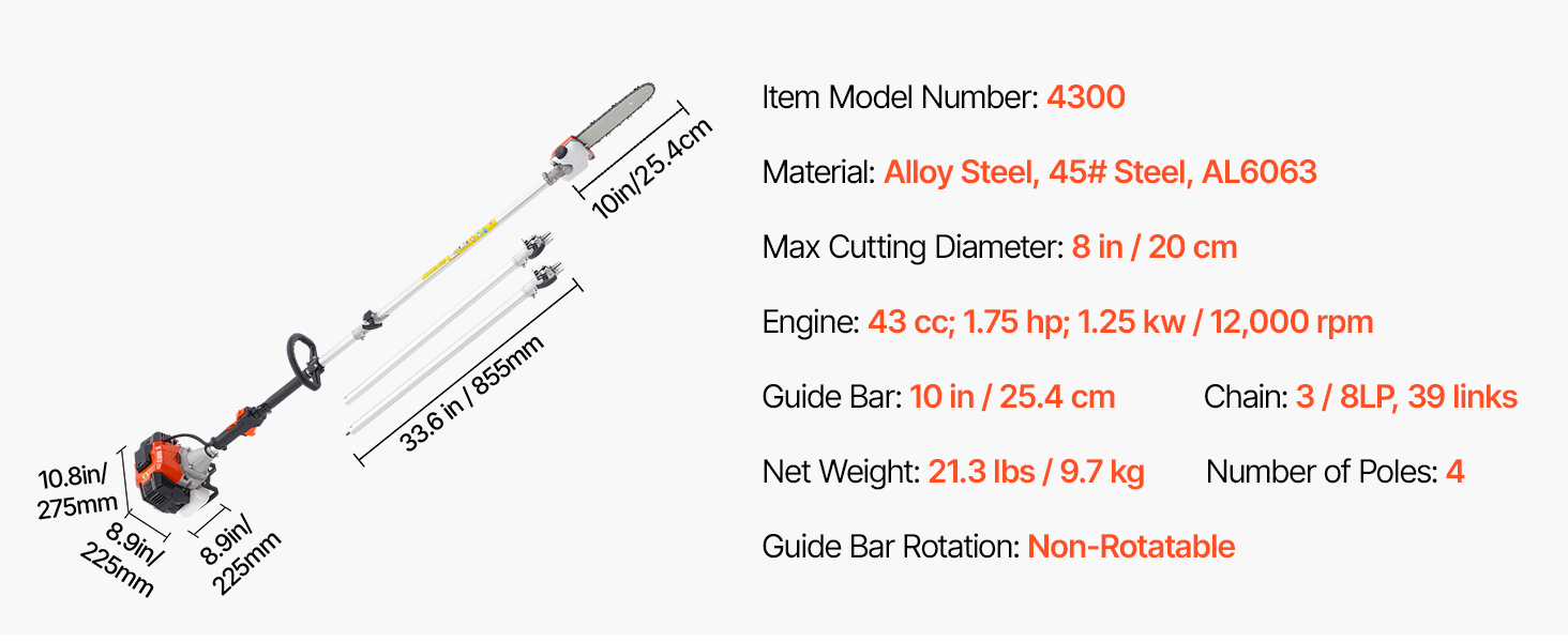 Táto benzínová píla na stĺpy je určená na vonkajšie prerezávanie a úpravu terénu a je vybavená vysoko výkonným 2-taktným benzínovým motorom, ktorý poskytuje silný výkon s jednoduchým štartovaním. Reťazová píla s priemerom 10" /25,4 cm zaručuje plynulé rezanie a vďaka akumulátorovej konštrukcii ľahko dosiahnete na vysoké konáre.