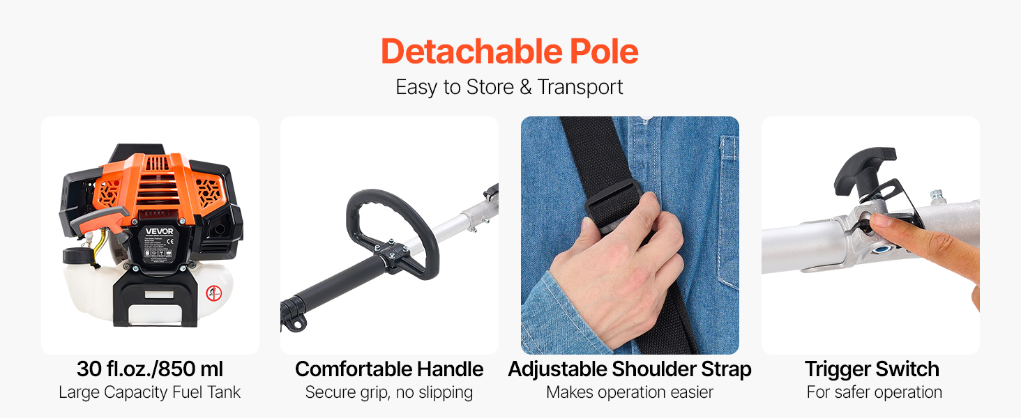 Plynová tyčová píla je navrhnutá pre pohodlie s ergonomickou rukoväťou a polstrovaným ramenným popruhom na zníženie únavy počas dlhšieho používania. Jej výsuvná tyč sa ľahko skladuje a prenáša. Veľkokapacitná palivová nádrž a funkcia automatického mazania zabezpečujú bezproblémovú prevádzku.