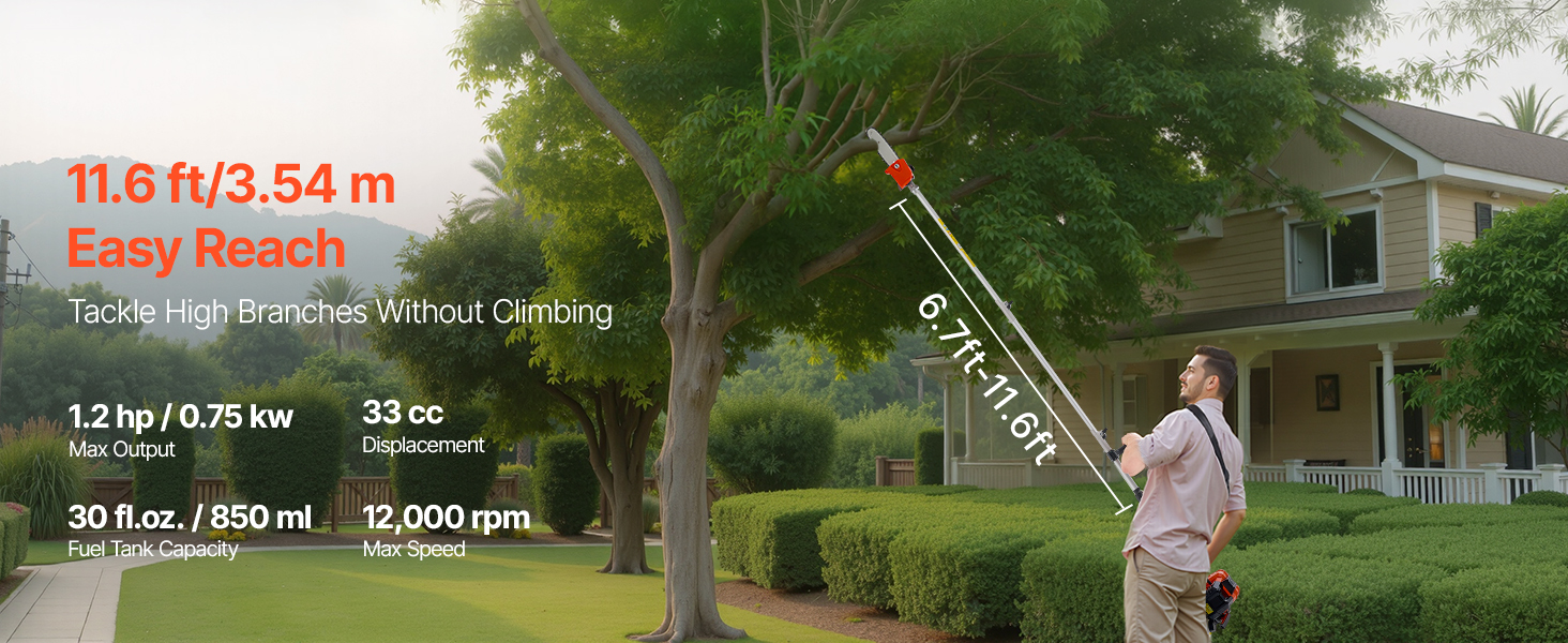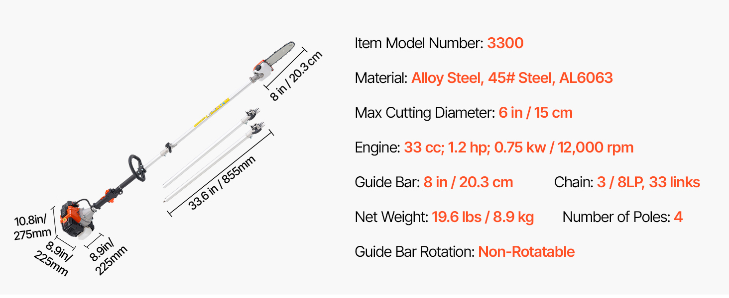 Motorová tyčová píla 33cc dvojtaktná 20.3 cm lišta 850ml 2–3.5 m