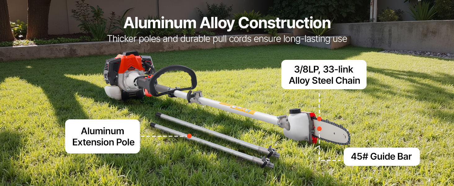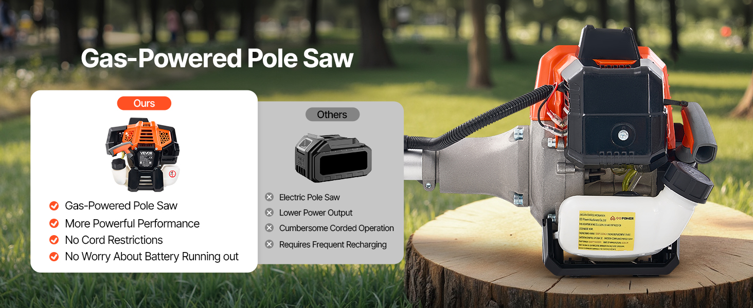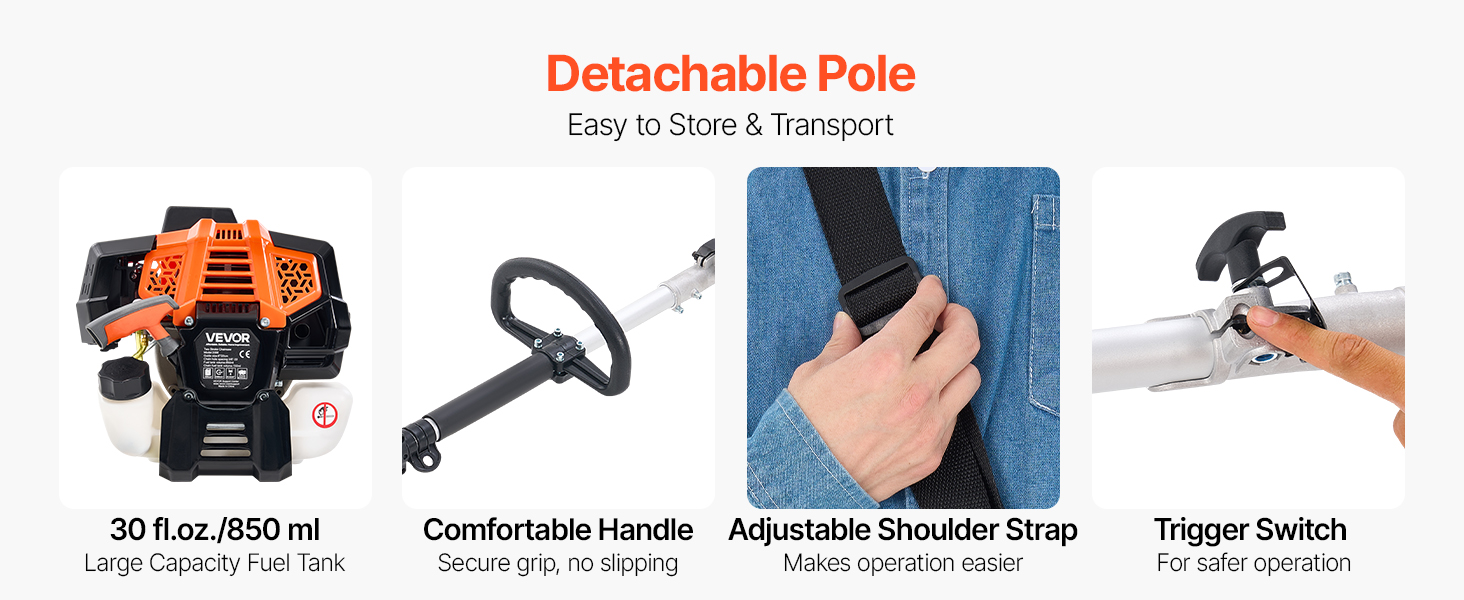 Plynová tyčová píla je navrhnutá pre pohodlie s ergonomickou rukoväťou a polstrovaným ramenným popruhom na zníženie únavy počas dlhšieho používania. Jej výsuvná tyč sa ľahko skladuje a prenáša. Veľkokapacitná palivová nádrž a funkcia automatického mazania zabezpečujú bezproblémovú prevádzku.