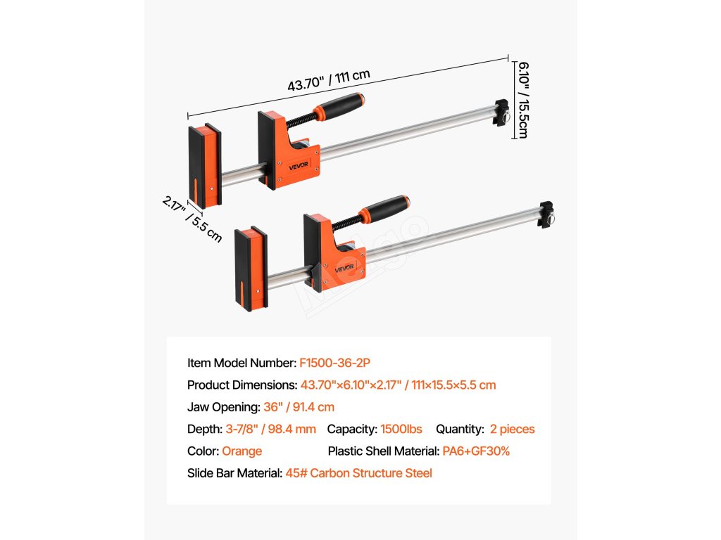 Tyčové svorky s 36-palcovým otvorom čeľustí sú navrhnuté tak, aby sa dali použiť pri rôznych prácach s drevom a kovom. Veľký otvor zabezpečuje presné polohovanie počas spracovania.