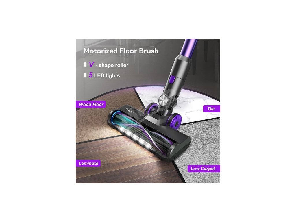 Motorizovaná podlahová hlavica s valčekom proti zamotaniu sa bezpečne kĺže po tvrdom dreve, dlaždiciach, lamináte a kobercoch s nízkym vlasom, zatiaľ čo päť LED svetiel vpredu osvetľuje skryté nečistoty a 180° otočná tyč vám umožní ľahko dosiahnuť pod pohovky, postele a schody.