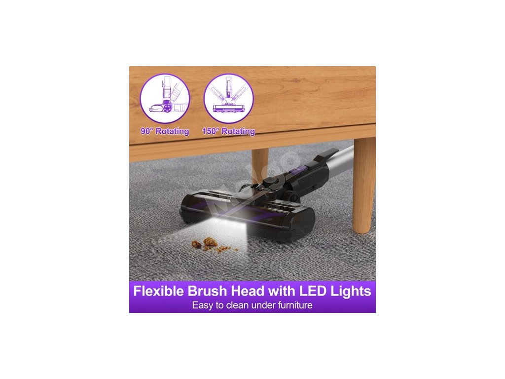 Flexibilná elektrická podlahová sacia hlava LED sa môže otáčať o 180° vľavo a vpravo a o 90° nahor a nadol, vďaka čomu je vhodná na čistenie nábytku a pod posteľou (viac ako 2 cm). Lampy LED podlahovej vysávacej hlavice pomôžu bezdrôtovým vysávačom osvetliť každý tmavý kút.