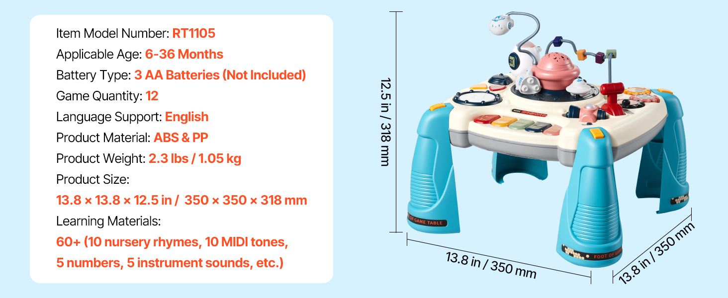 Tento vzdelávací hudobný stôl má posilnené zasúvacie nohy a protišmykové pätky pre stabilnú hru. Robustné telo z ABS je schválené rodičmi. Stôl funguje na 3 AA batérie (nie sú súčasťou balenia), aby bol priestor na hranie uprataný a bez káblov.